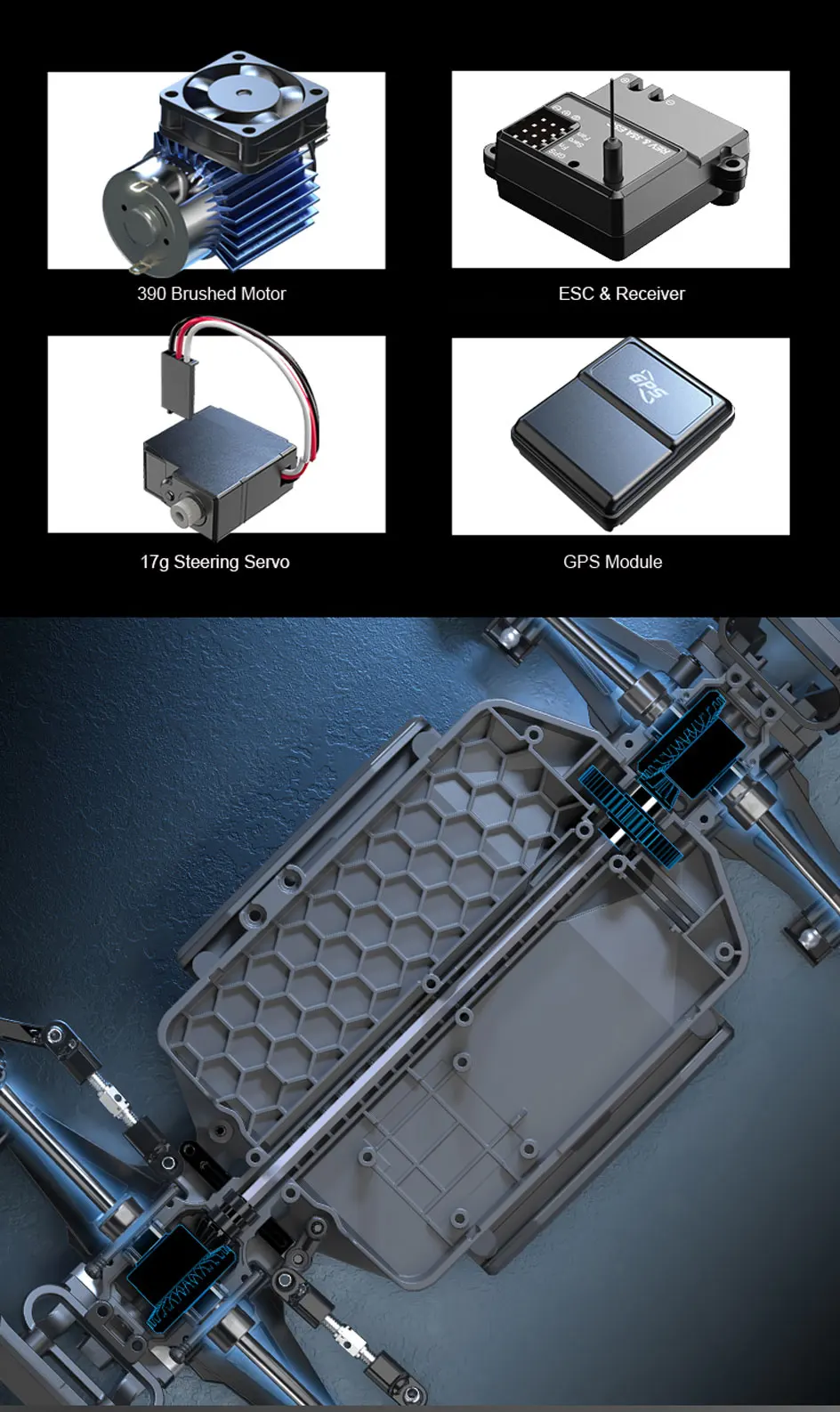 4. The maximum speed is 45km/h with 3S battery, which is comparable to brushless performance;