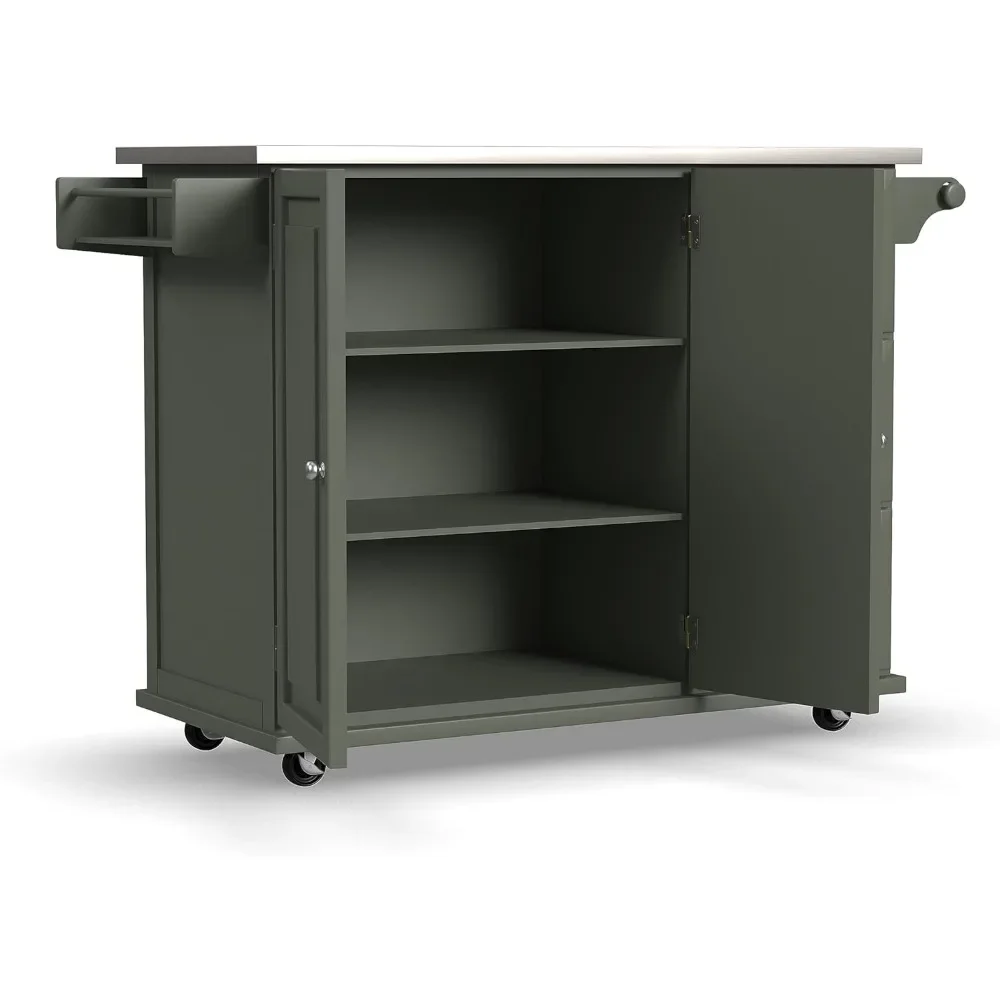 Maximize the storage space and work surface in your kitchen with this Dolly Madison Kitchen Cart by . The stainless steel surface sits atop a sage green, durable engineered wood frame, which can be easily moved throughout your space on lockable casters to bring convenience right where it's needed most. Loaded with space-saving features and storage options, it brings the ultimate in versatility and charm to your kitchen.