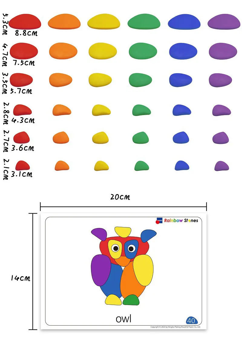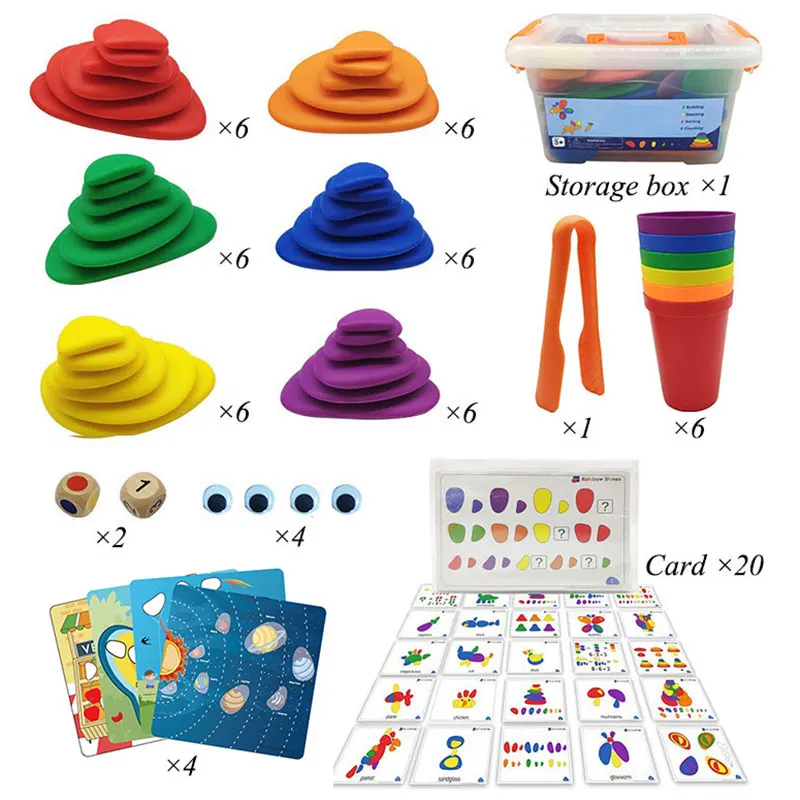 New Colorful Set: packing box x 1 + storage bag x 1 + clip x 1 + dice x 2 + eyes x 4 + colored pebbles x 36 + puzzle card x 20 + scene card x 4