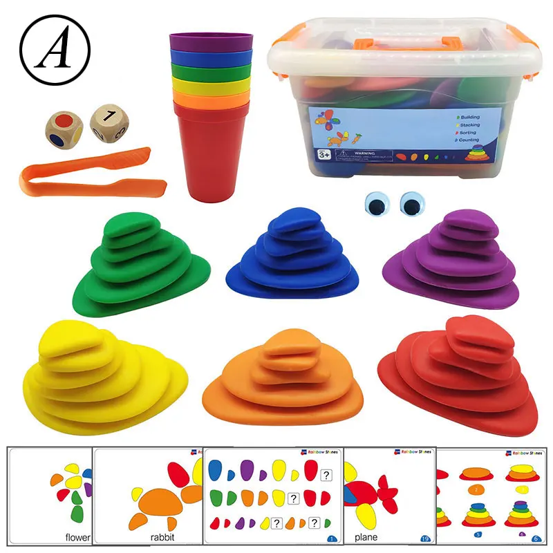 Colorful Set: clip x1 + cup x 6 + color pebbles x 36 + dice x 2 + eyes x 4 + puzzle card x 20 + storage box x 1