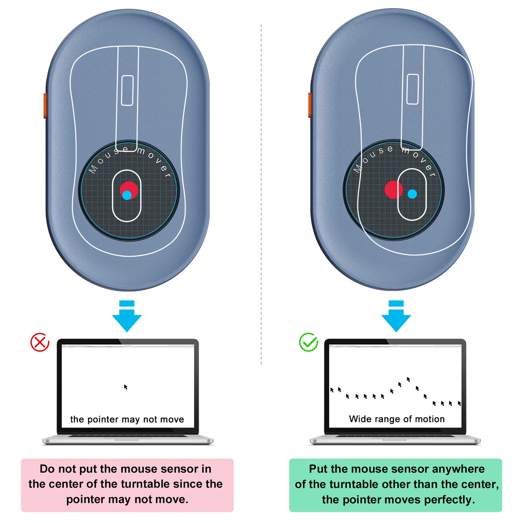 【Warm Reminder】 Please make sure the red light of your mouse is casting on the spinning wheel, turn on the mouse jiggler, then you can use it.