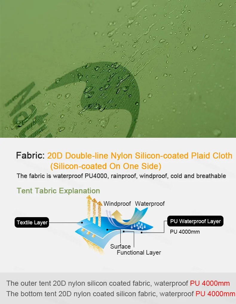 Outer Tent Waterproof: PU Coating Waterproof 4000mm