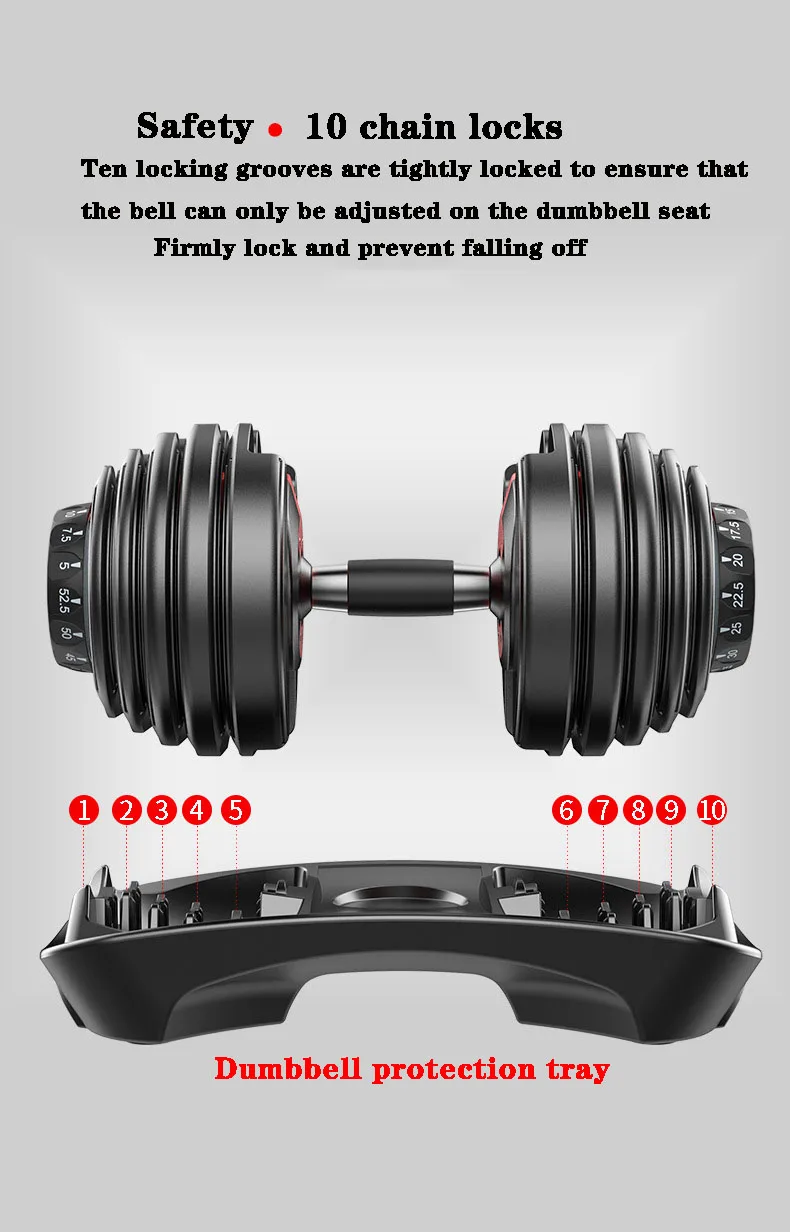 Security: 10 chain locks and 10 lock grooves to ensure that the dumbbells can only be adjusted on the dumbbell seat to be firmly locked and prevent falling off