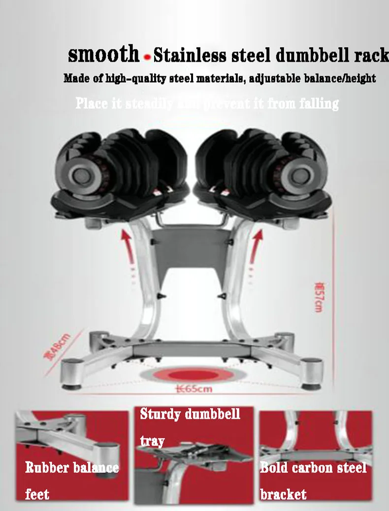 The stable stainless steel dumbbell rack is made of high-quality steel, which can be adjusted for balance/height and puts it smoothly to prevent falling. Rubber balance feet. Sturdy dumbbell tray. Bold carbon steel bracket.