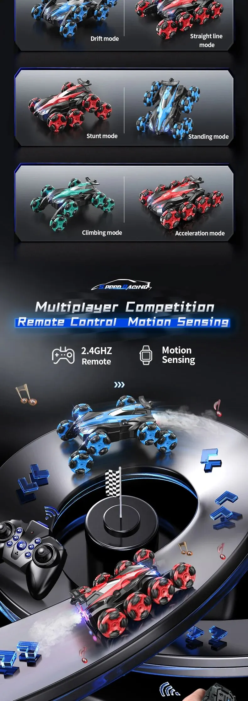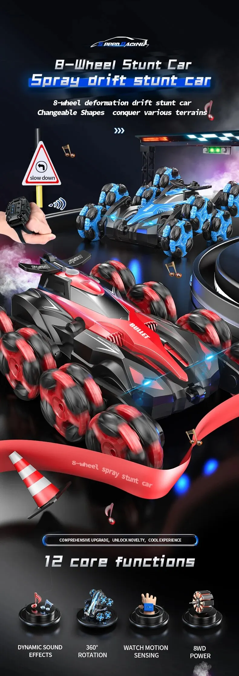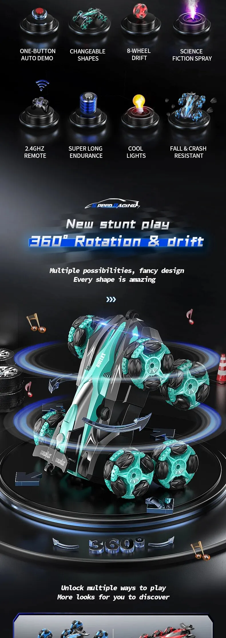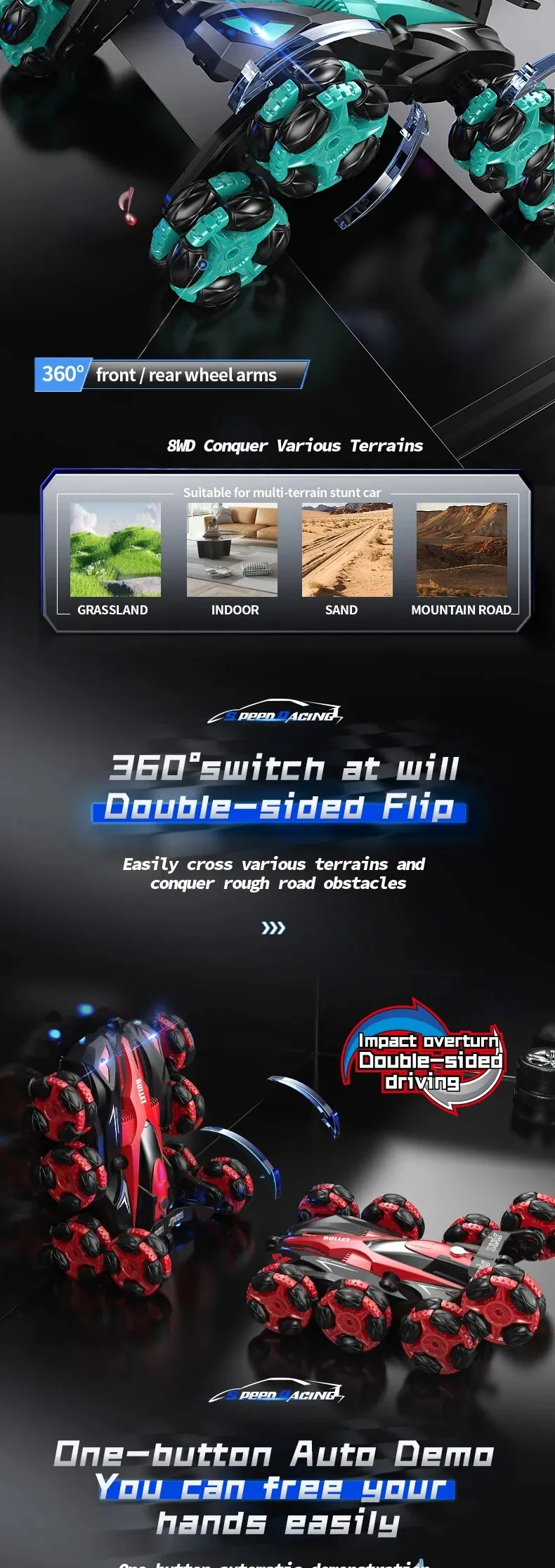 ?RC STUNT CAR TOY-Our 2.4Ghz remote control car is the perfect toy for boys ages 4-7, 8-12. Featuring 8 independently controlled wheels, this RC car can perform stunts at the touch of a button. With 360 degrees rotating capabilities and the ability to race, drift, double-sided drive and climb obstacles, your kids imagination will soar with endless possibilities?.
