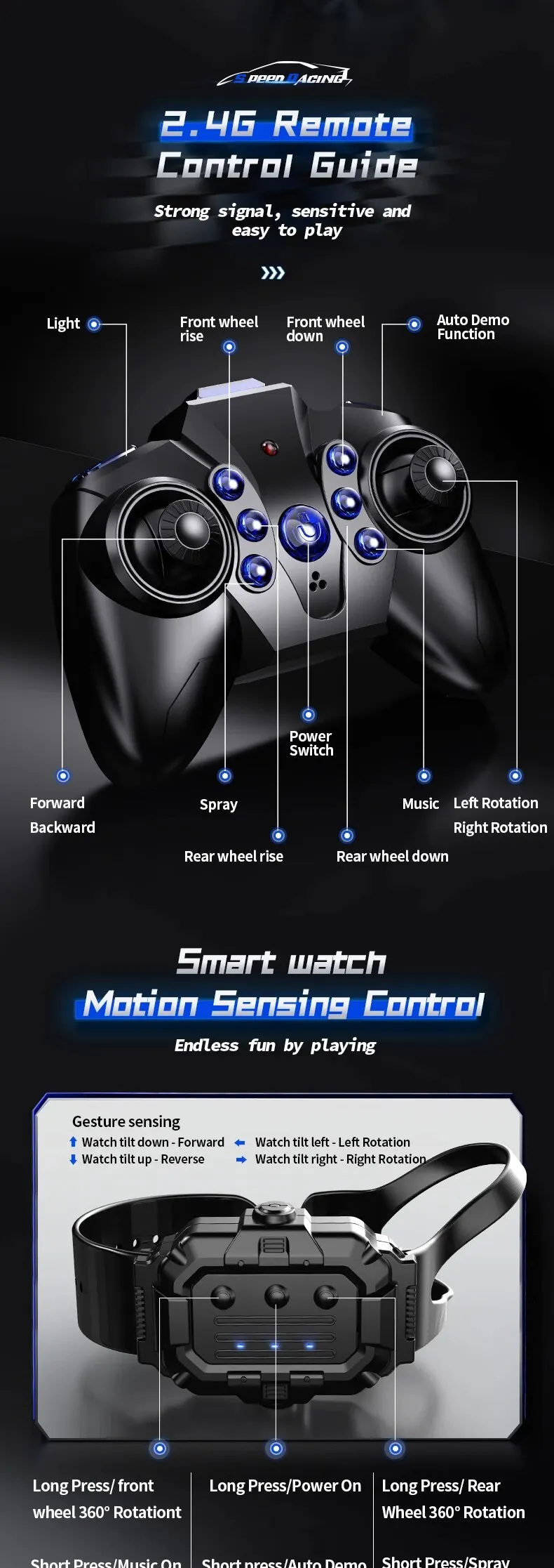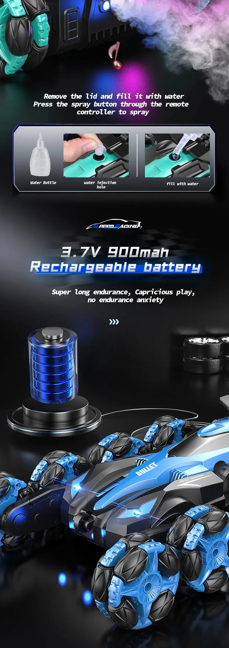 ?SPRAY DESIGN -Add water to the rear of the car and watch as the RC car emits a "blue flame" under the LED lights?, providing an even cooler experience for your kids. The spray design is sure to make our remote control car for boys stand out from the rest.