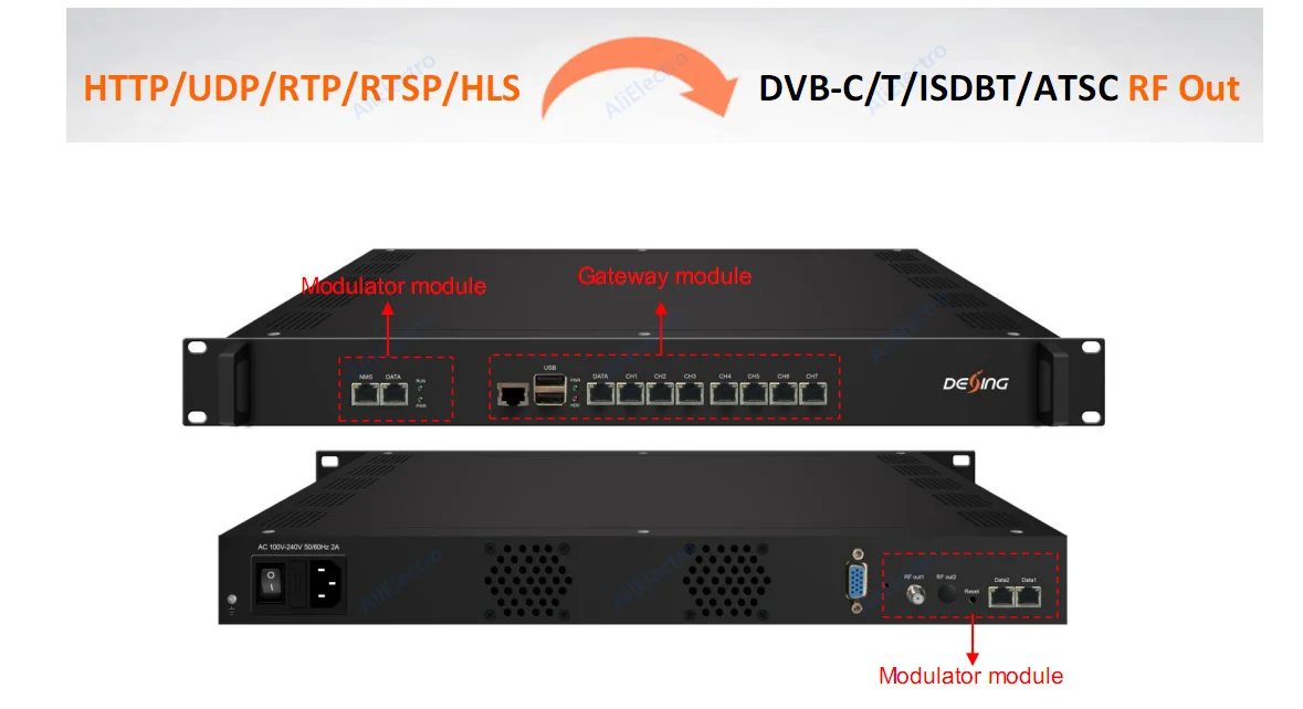• NEW IPTV Modulator IP (HTTP/RTSP/RTP/UDP/HLS) To Digital Radio Frequency (DVB-C/T/ISDBT/ATSC) FTTH Cable TV Front-end Equipment