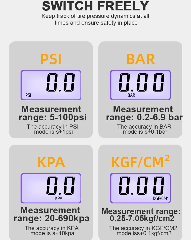 • LCD display :The product features an LCD display that makes it easy to read and understand the tire pressure information.
