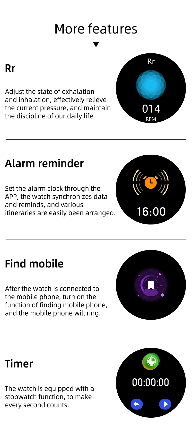 rate measurement, Heart rate monitor, Family and friends remote care, Multi-sport mode, Exercise measurement