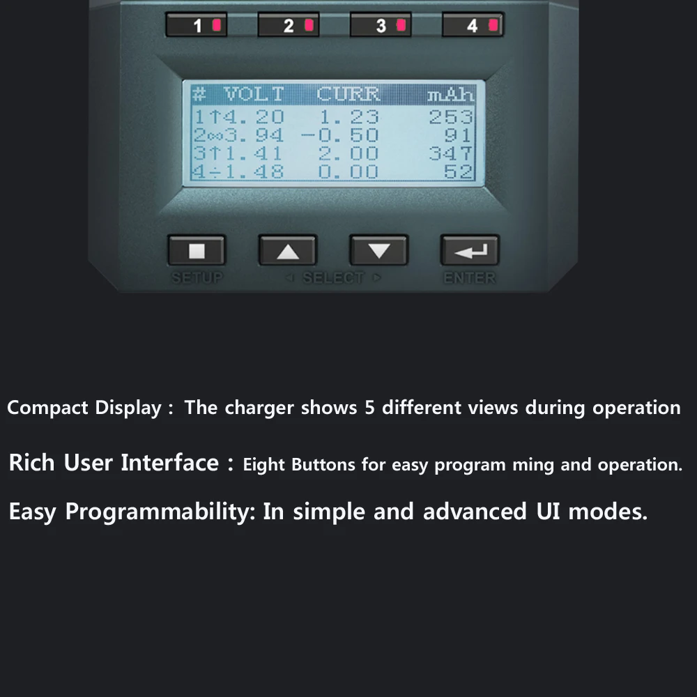 The entire charging process is all in your control by just 8 buttons. 30 user-defined profiles can be set