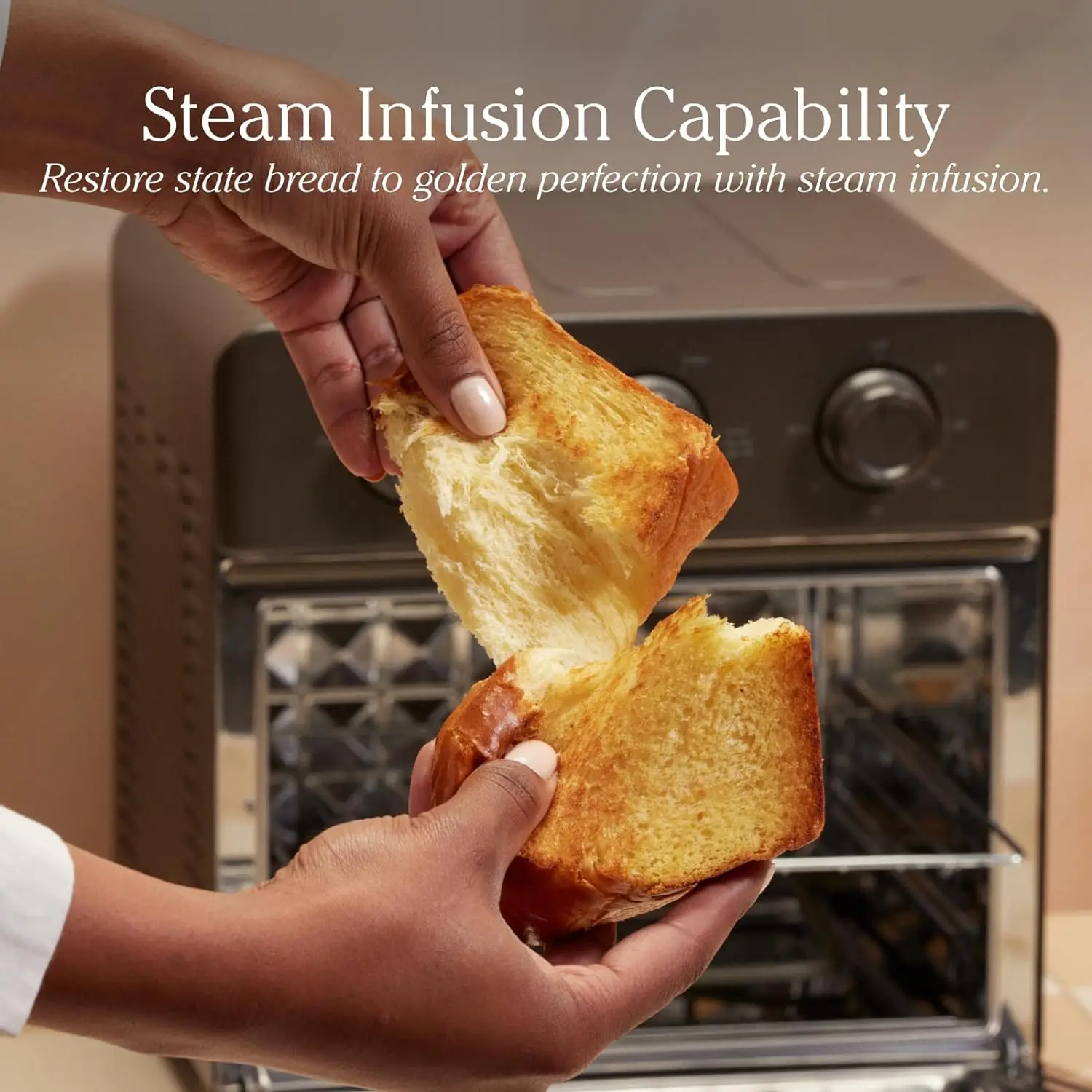 VERSATILE 6-IN-1 AIR FRYER & TOASTER OVEN: This compact countertop appliance is your all-in-one solution for air frying, toasting, roasting, baking, reheating, and broiling, with added steam infusion technology for perfectly-cooked food.