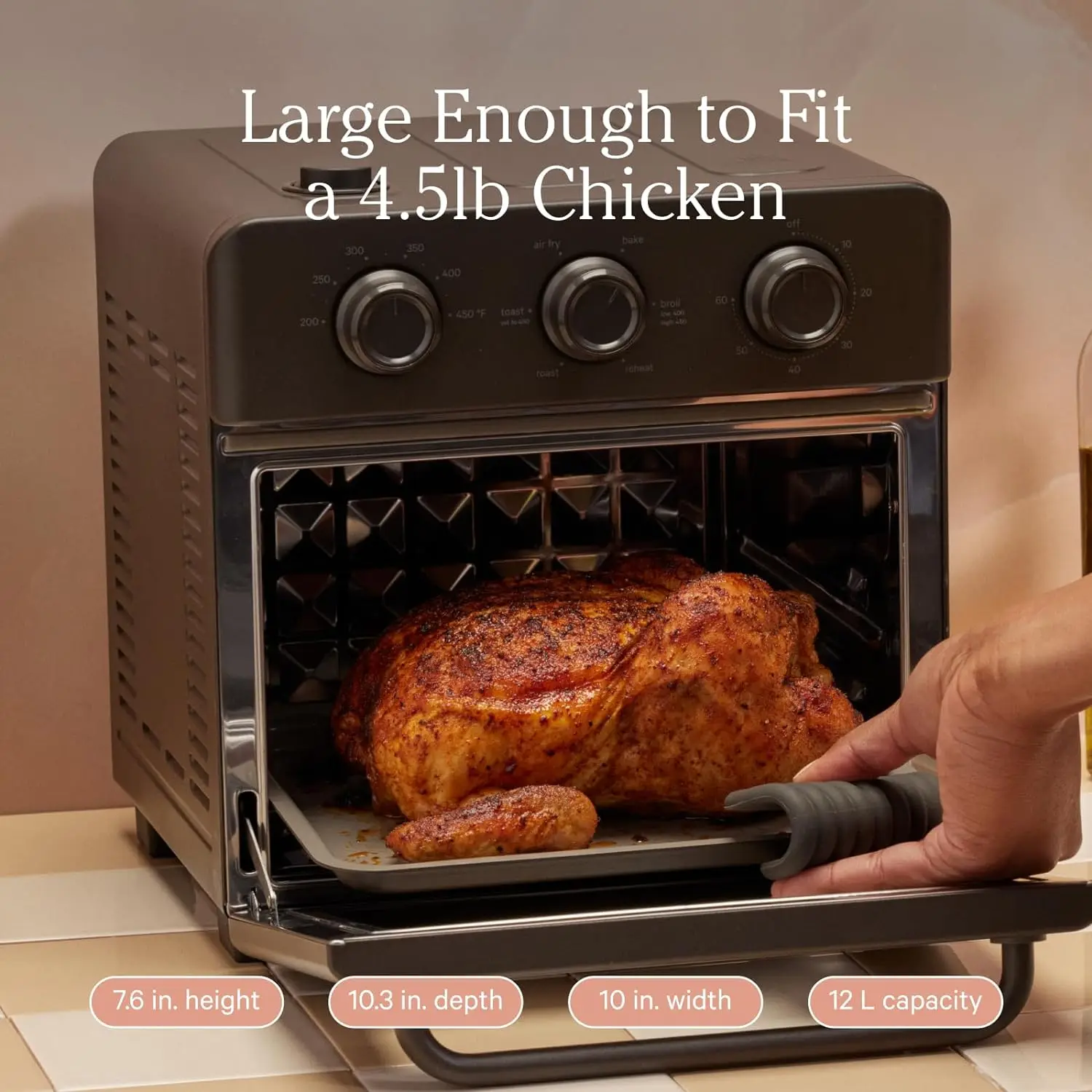 EFFICIENT, SPACE-SAVING DESIGN: Roast a 4.5-pound chicken or cook double the capacity of a stand-alone air fryer. It’s versatile, efficient, and compact.