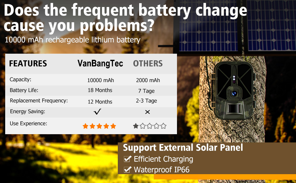 - Extended Battery Life: This wildlife camera is equipped with a 10,000 mAh rechargeable Li-ion battery. Compared with other off-road cameras using AA batteries, it reduces battery consumption, is more environmentally friendly, and has a longer standby time. So you can save a lot of money and time in the long run