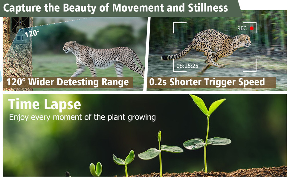 - Lightning-Fast Responsiveness: At only 0.2 seconds of detection speed, our wildlife camera ensures that no movement goes undetected. So you won’t miss any wonderful moments of wildlife, and you can better observe or trail wildlife.