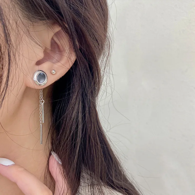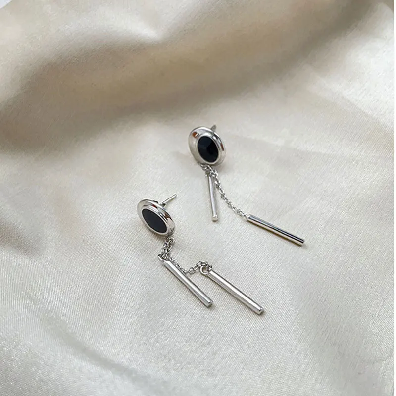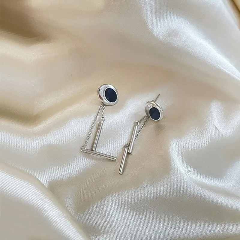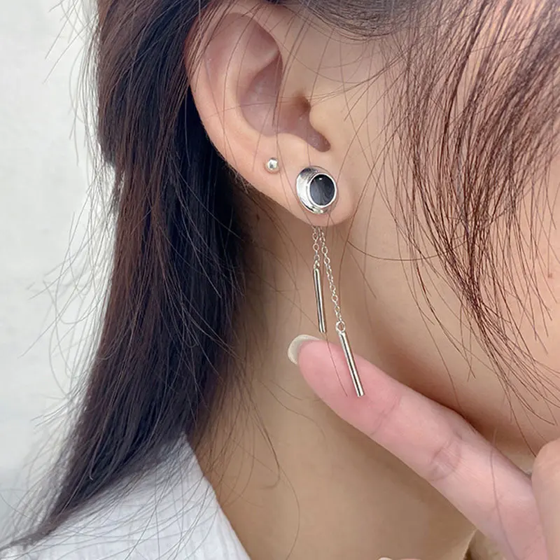 Oval Black Enamel Stud Earring Sterling Silver Dainty Hypoallergenic Geometric Double Bar Tassel Dangle Drop Earrings for Women