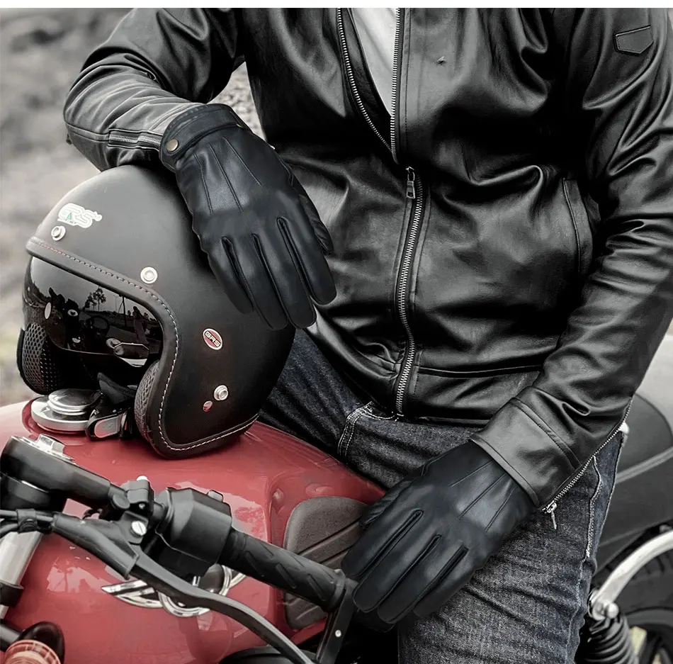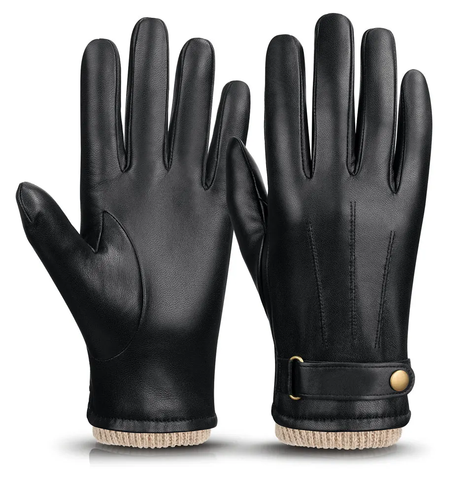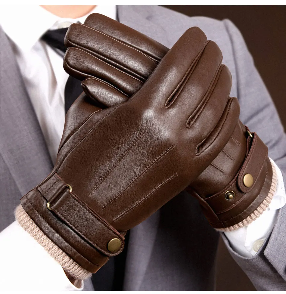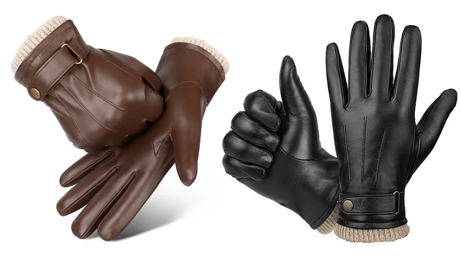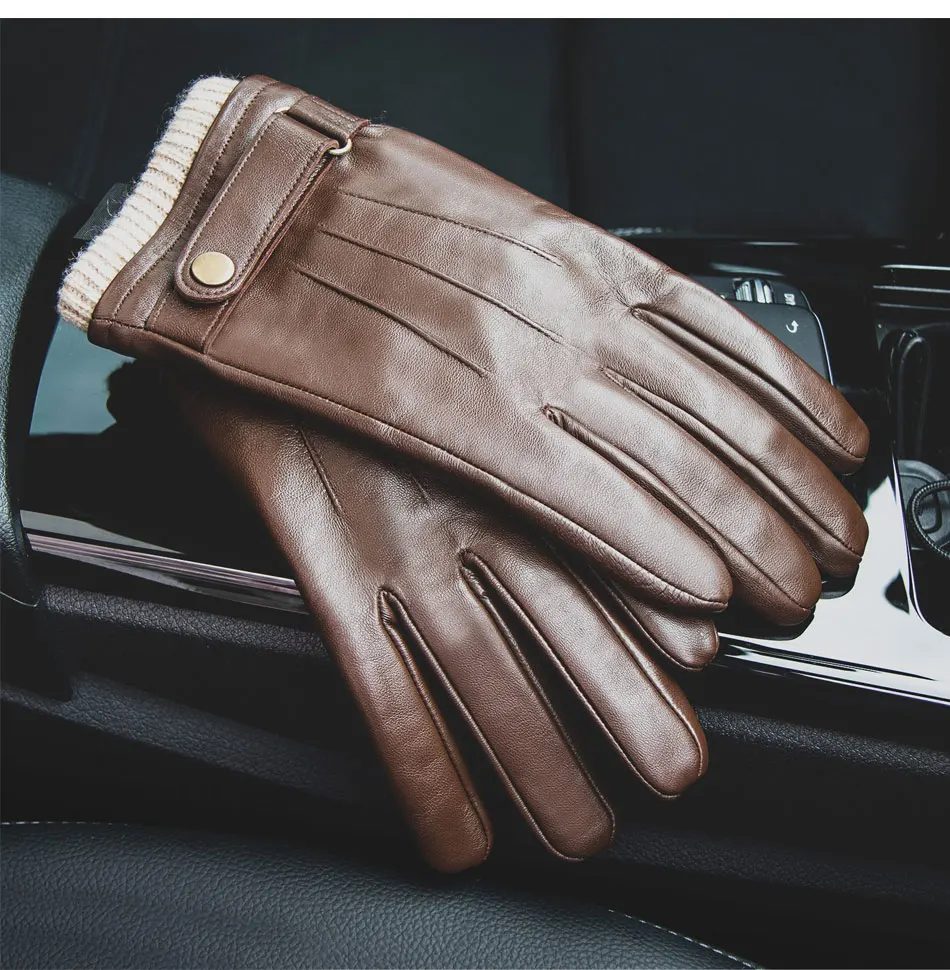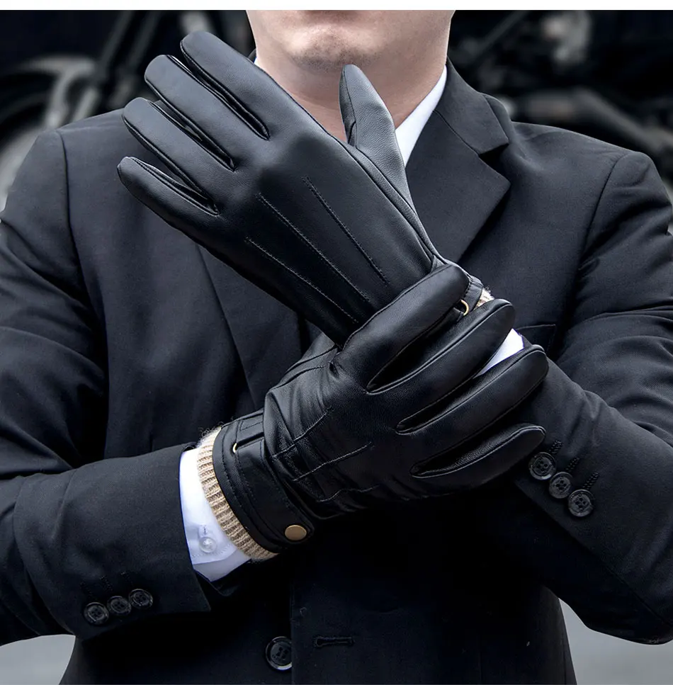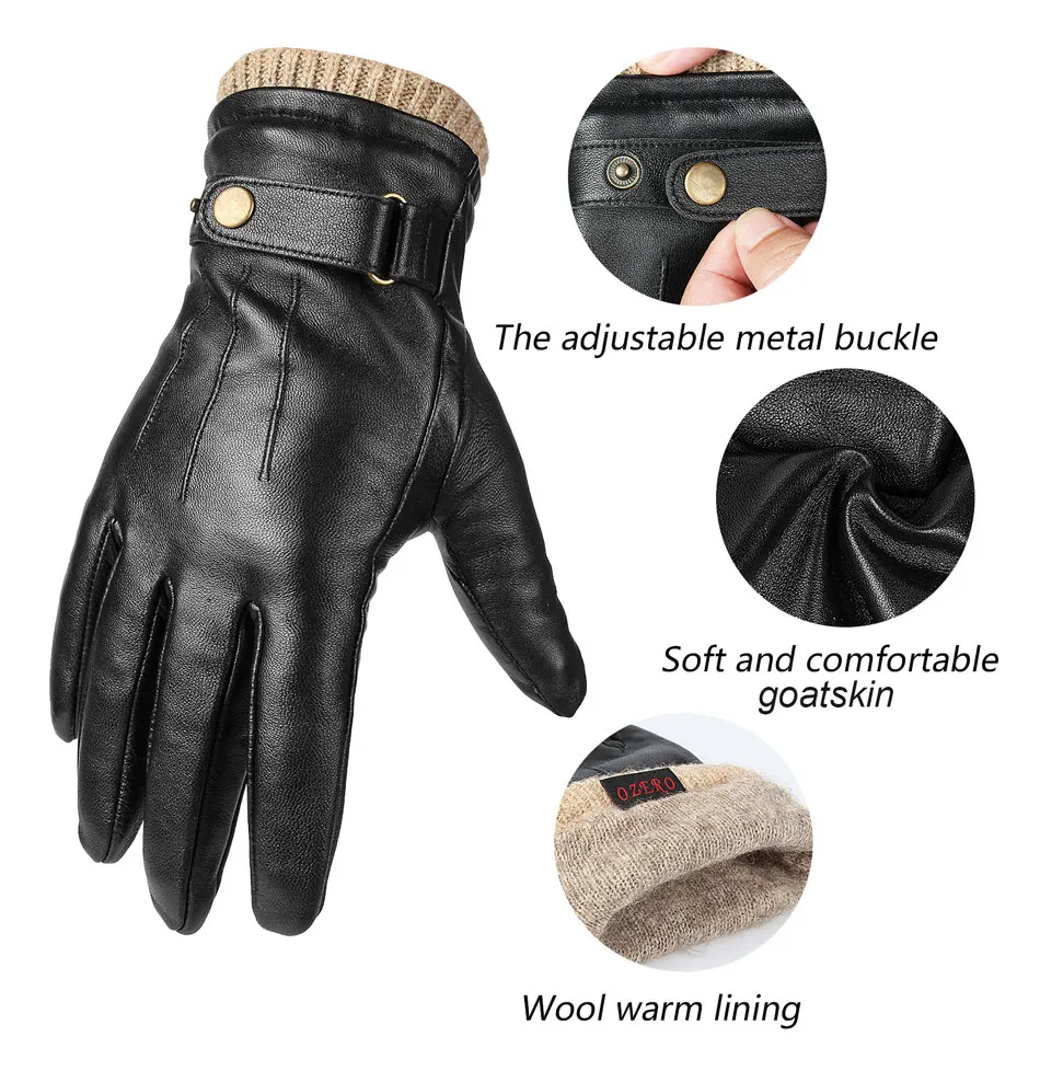 OZERO Men Goatskin Leather Gloves Autumn Winter Warm Touch Screen Waterproof Full Finger High Quality Black Driving Gloves