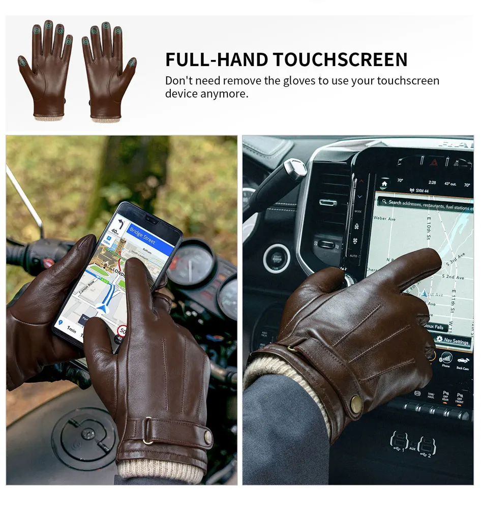 Gloves with sensitive touch screen function, allow all your fingers to work on your touchscreen devices. Our leather gloves will keep hands warm, cozy and flexible while your are driving or walking.