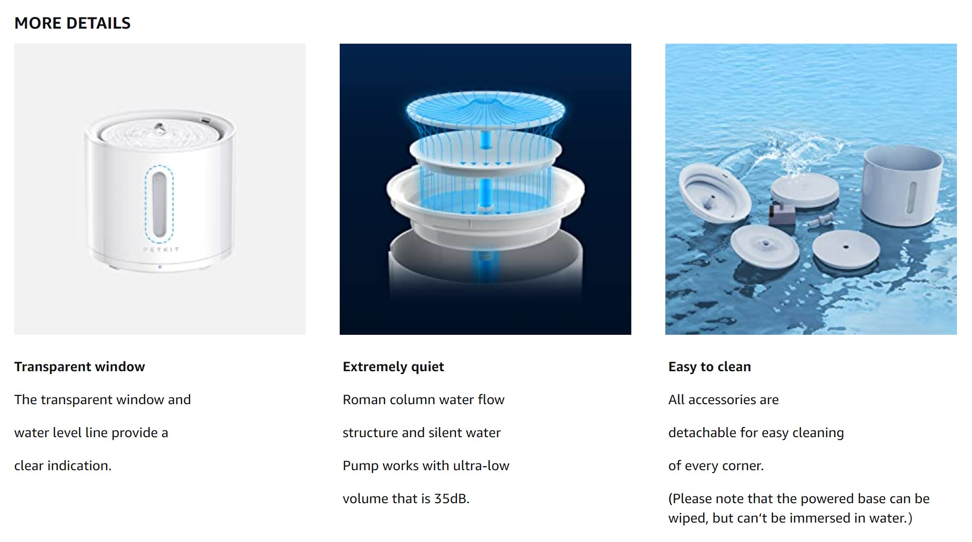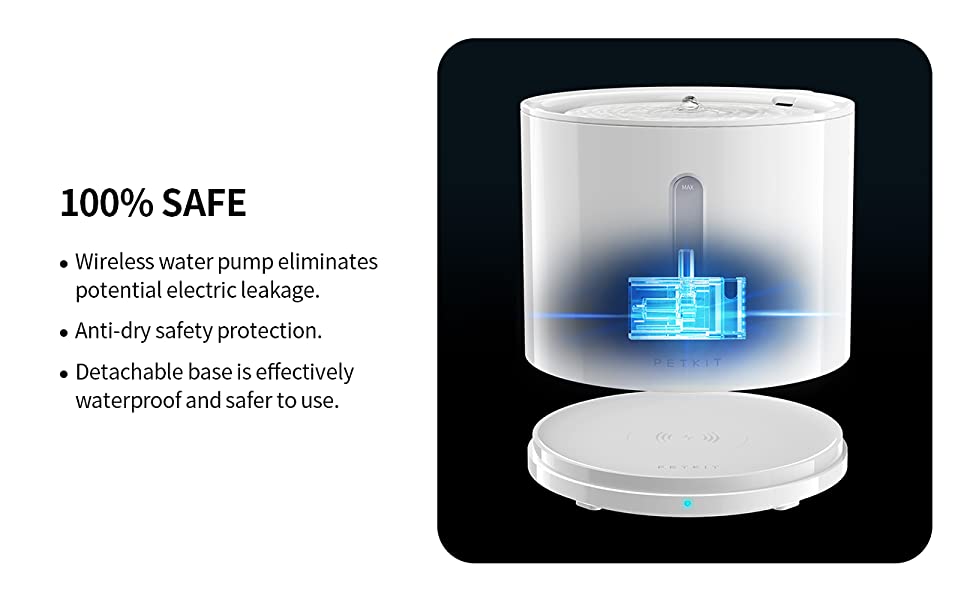 [Detachable Design] With the detachable water fountain body and base,You won't get the powered base wet when topping up water or cleaning up the fountain