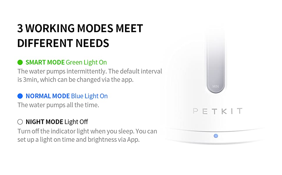 [3 Working Modes] Smart Mode,Normal Mode and Night Mode are applied to different conditions Capacity: 2L, meets your pets' water intake