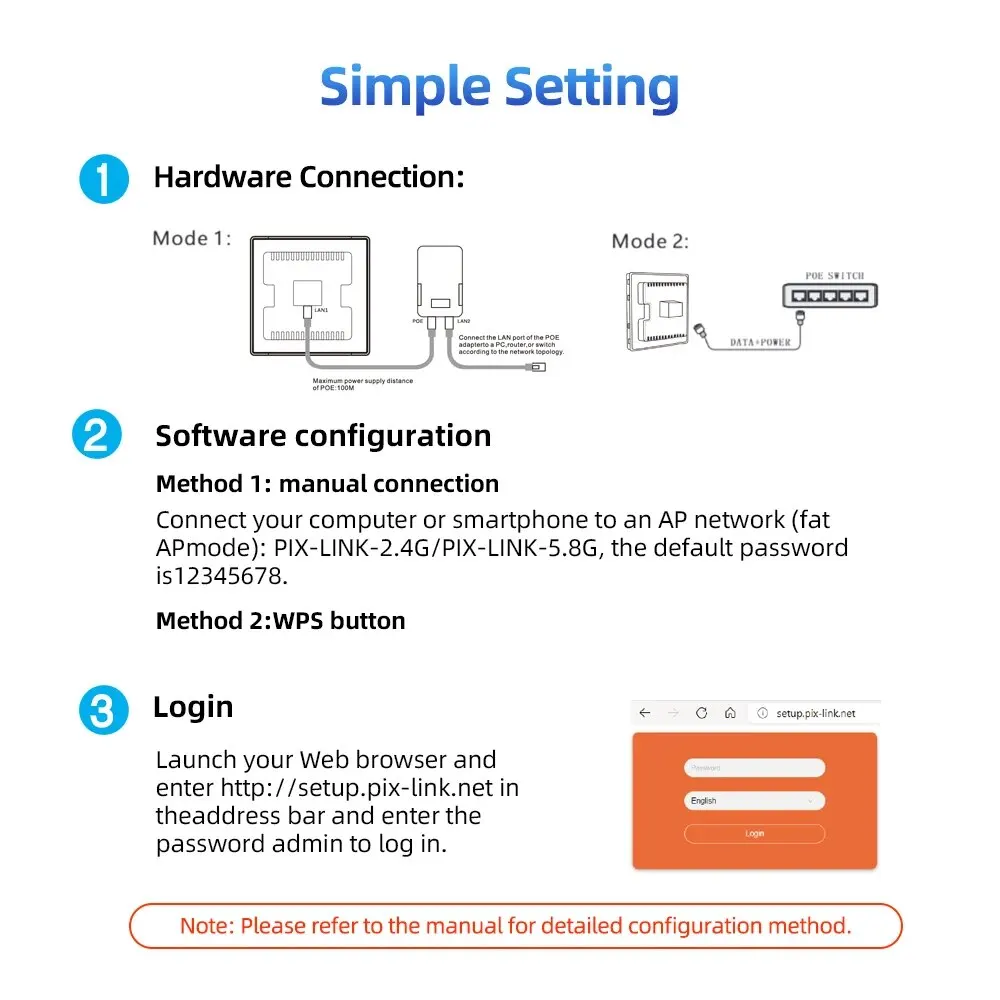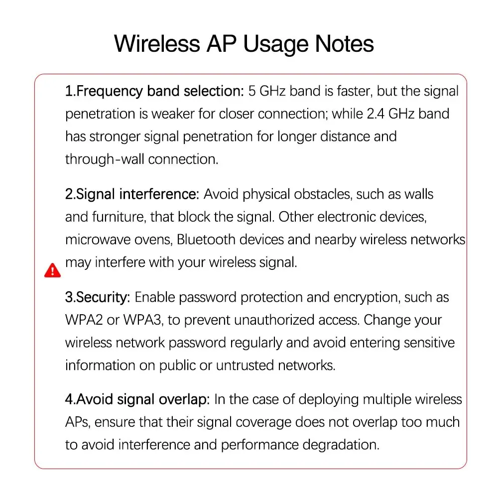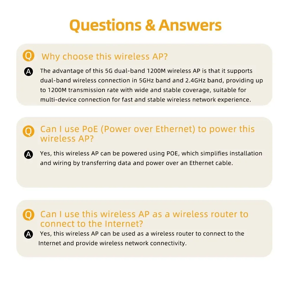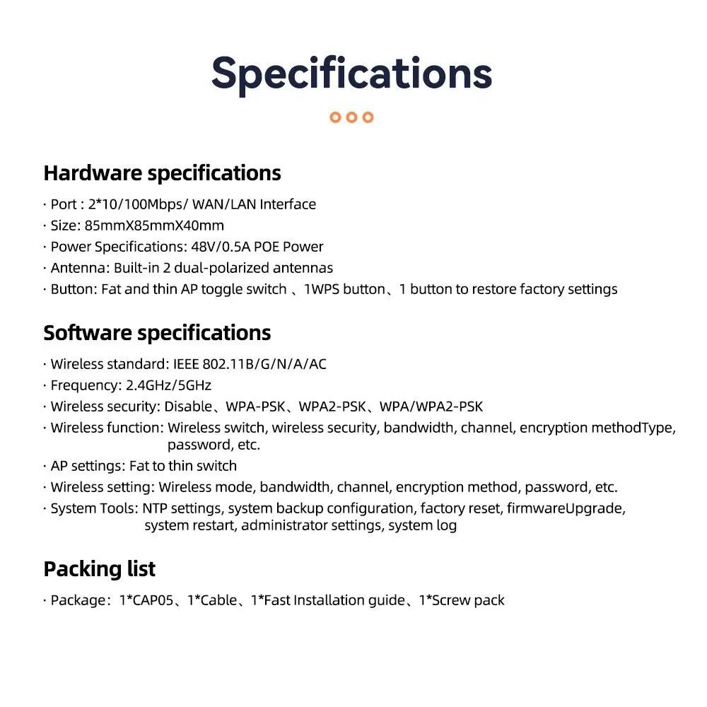 • Dual-band Wireless Panel :The access point supports both 2.4GHz and 5GHz bands, providing stable and fast wireless connectivity.