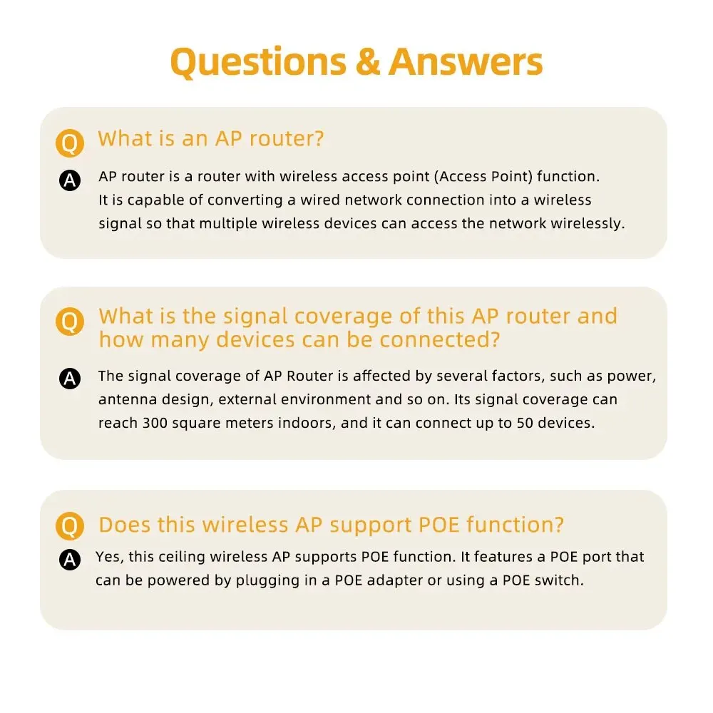 • POE WiFi AP :The access point comes with a built-in POE (Power over Ethernet) switch, making it easy to install and use without the need for additional power supplies.