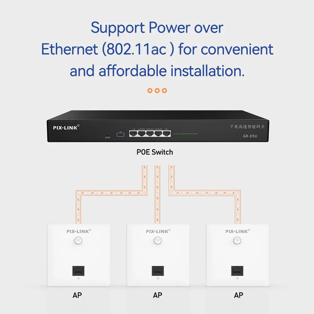 National standard 86 type panel design , POE power supply , easy to install and easy to use:The national standard 86 fat panel design can direct replace the og nal network panel without rewiringor destroying the original decoration Support 802 . 3af /atbiaoia POE network cable is used for power supply .each AP only needs one network cable which is not restricted by power supply conditions , AP deploymentIs simple , and construction is convenient .