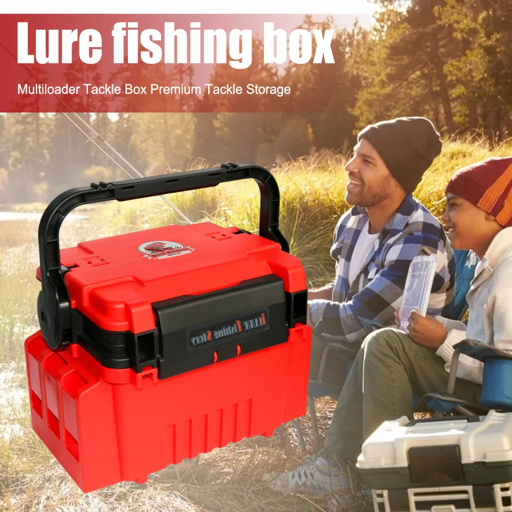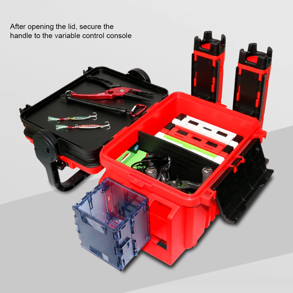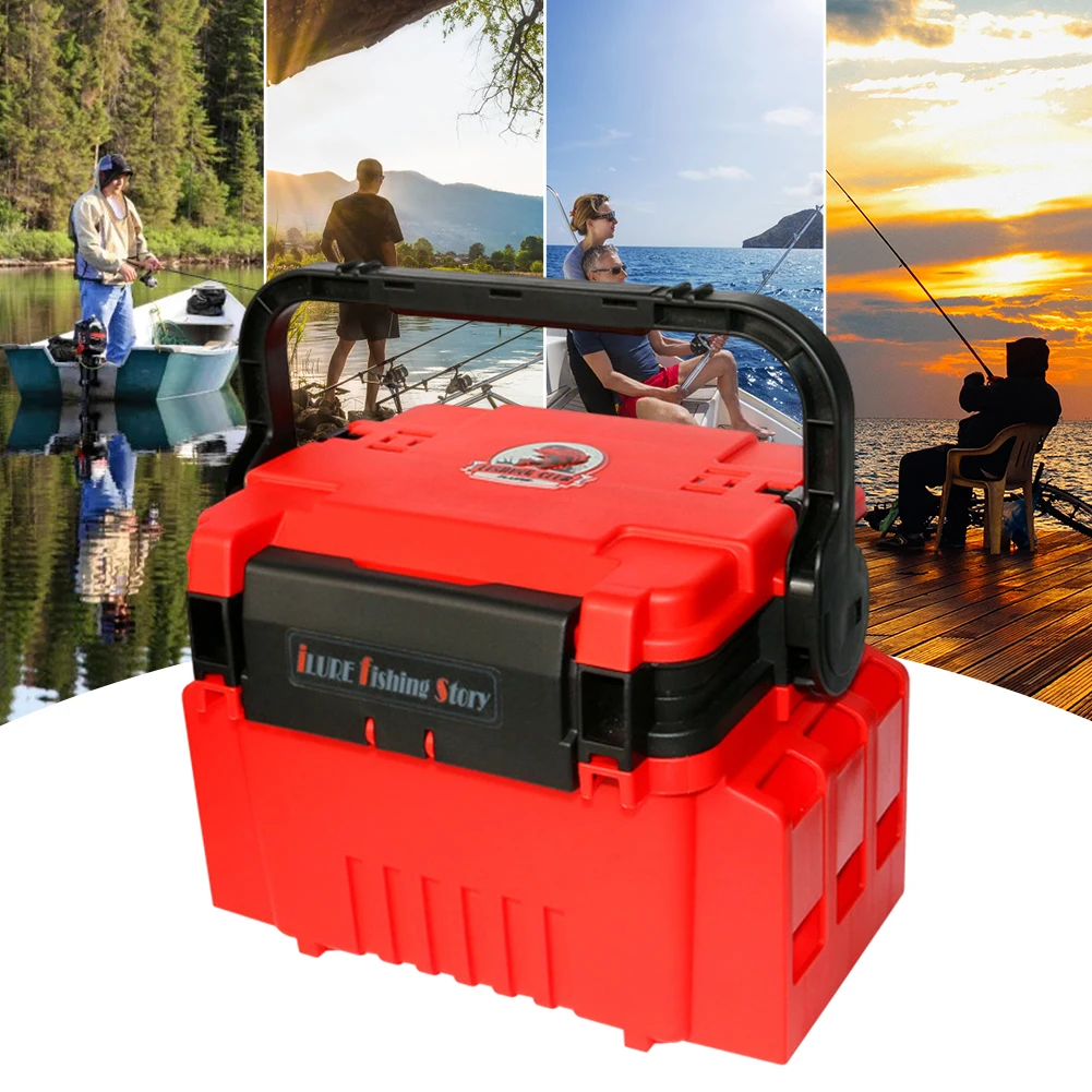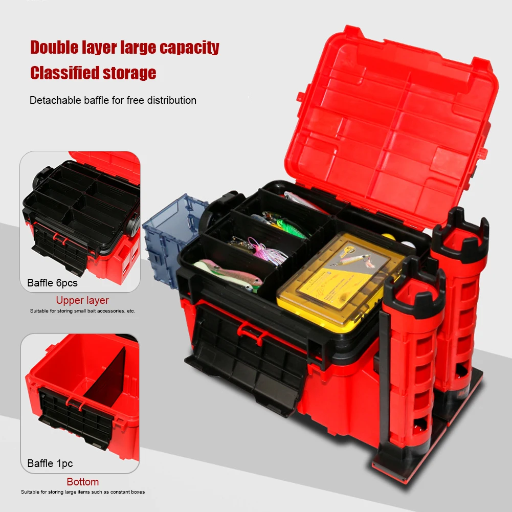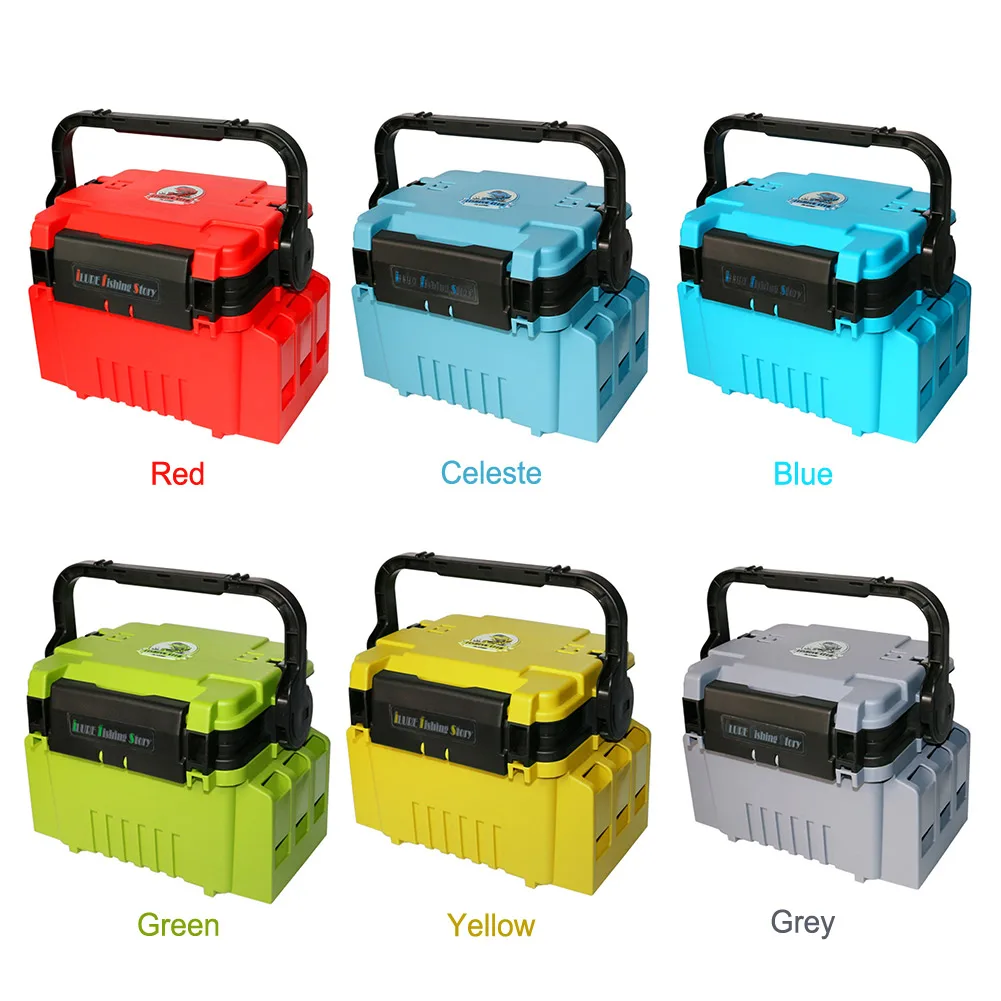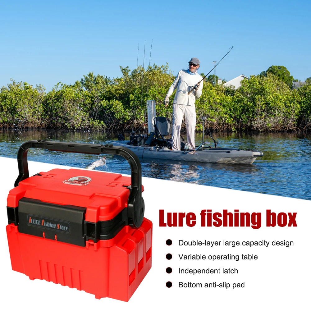 Features: 1. High quality material: Made of ABS+PP material, durable and environmentally friendly. 2. Large capacity: Double layer large capacity design, classified storage, improving usage efficiency. 3. Convenient to use: The handle can be fixed and turned into a console for easy operation. 4. Safe: Independent locking buckle with self-locking and manual locking functions, making it safer and more reliable. 5. Anti slip: The bottom is equipped with anti slip pad design, which is not easy to slide and more durable. Specification: Origin: Mainland China Model Number: Fishing Tackle Box Product material: ABS+PP Product colors: red, celeste, blue, green, yellow, gray (optional) Product size: 31.5 * 23 * 17.7cm/12.4*9.06*6.97inch