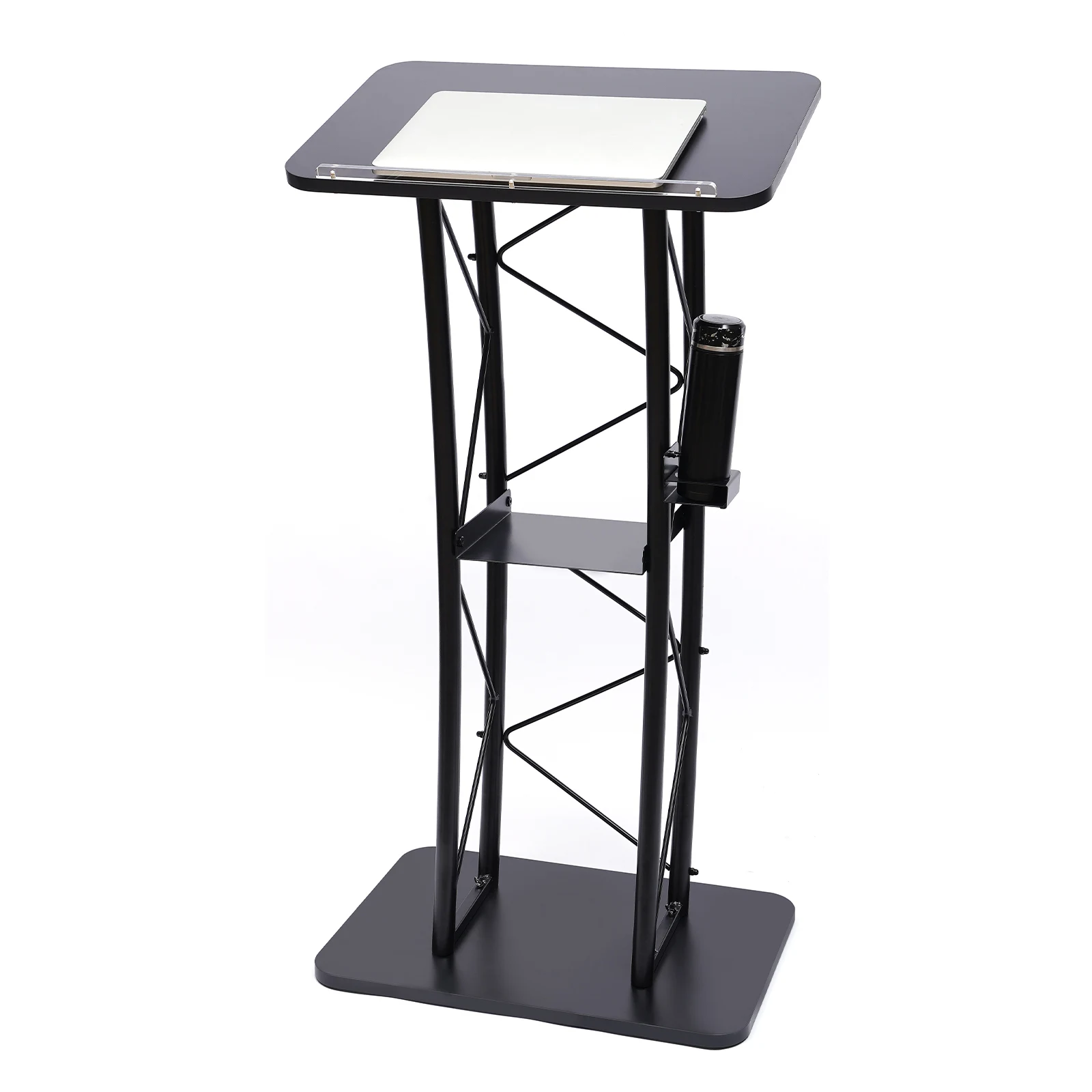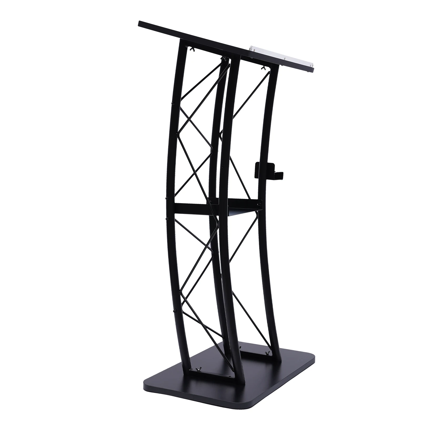 The stand of this curved podium is made of high-quality iron, so it is very stable. The black color scheme and the curved design make this podium simple and stylish at the same time. It has a sturdy but very modern construction. It is ideal for schools, conferences, events, churches, and classrooms.