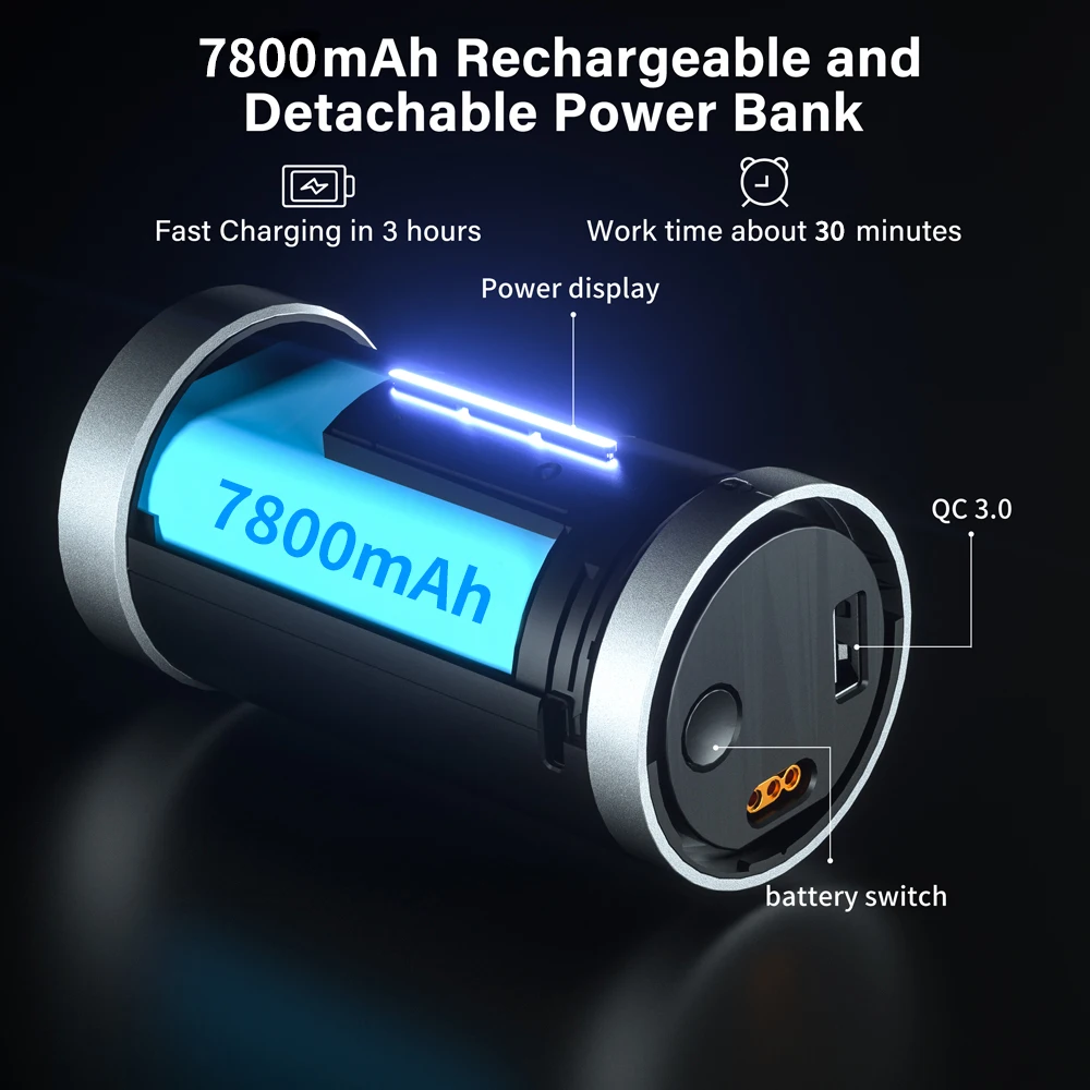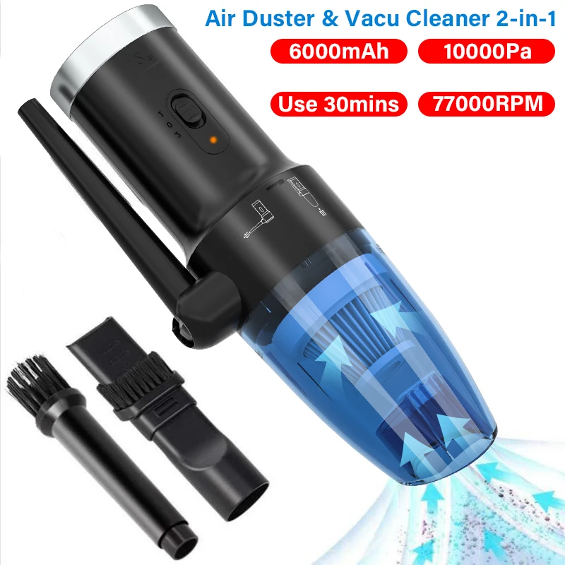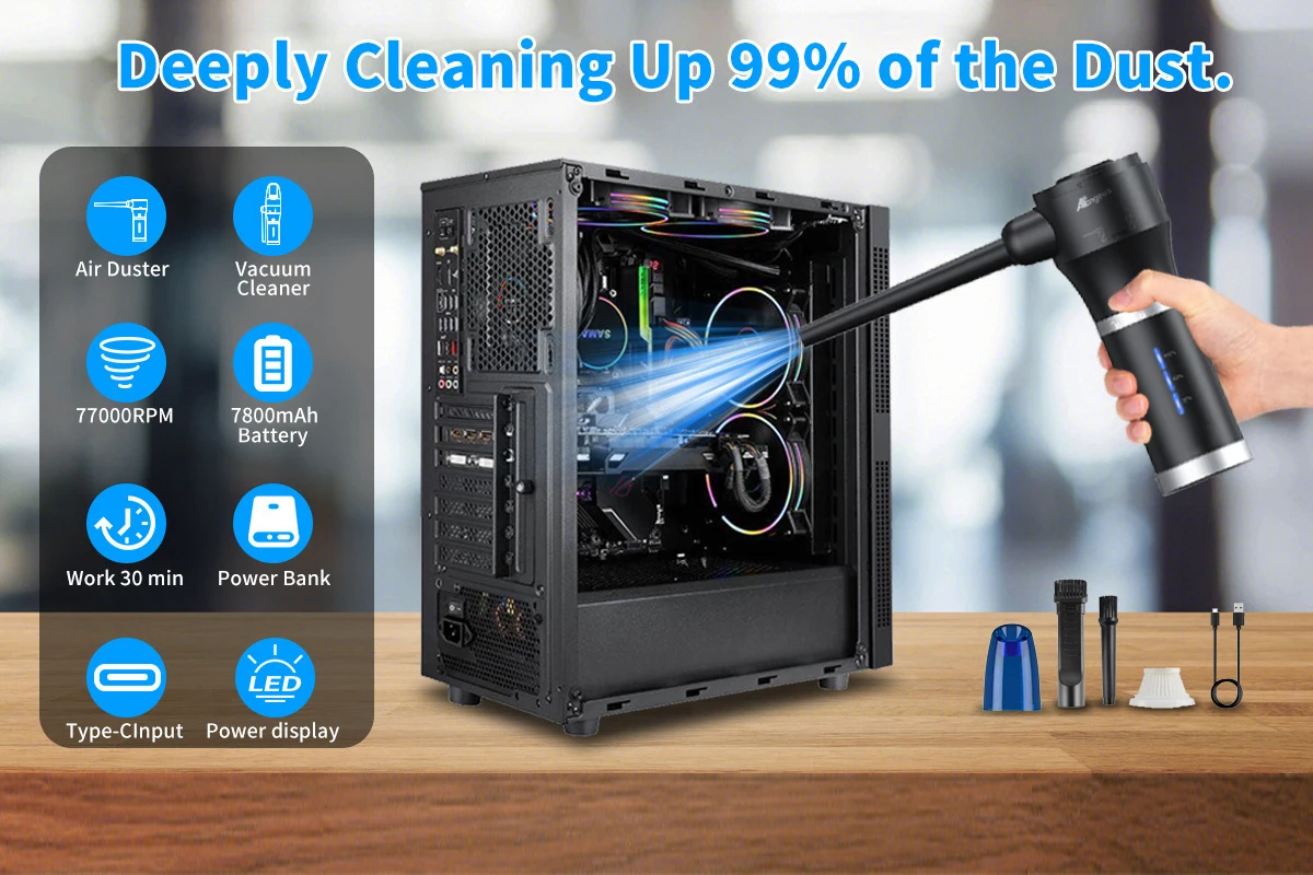 The Mini air blower built-in 7800mAh removable batteries can be for thousands of re-uses. It can also be used as a power bank.15W fast charge greatly reduces the charging time (7 hours fully charged). Even in a high output state, this dust collector can work for up to 30 minutes after a full charg,and when working at low gear, it can work continuously for 30 minutes.