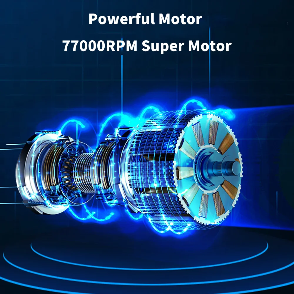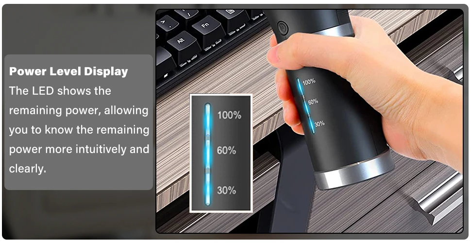 This newest Cordless air duster has an increased motor speed from 60,000 rpm to 77,000 rpm, which produces a powerful thrust of air over 11 levels strong gale (32m/s) for deep cleaning of the microscopic dust. Besides, the suction reached 11KPa Max. With such a more powerful motor, this portable duster can more efficiently clean items that cannot be cleaned by traditional wipers or dusters