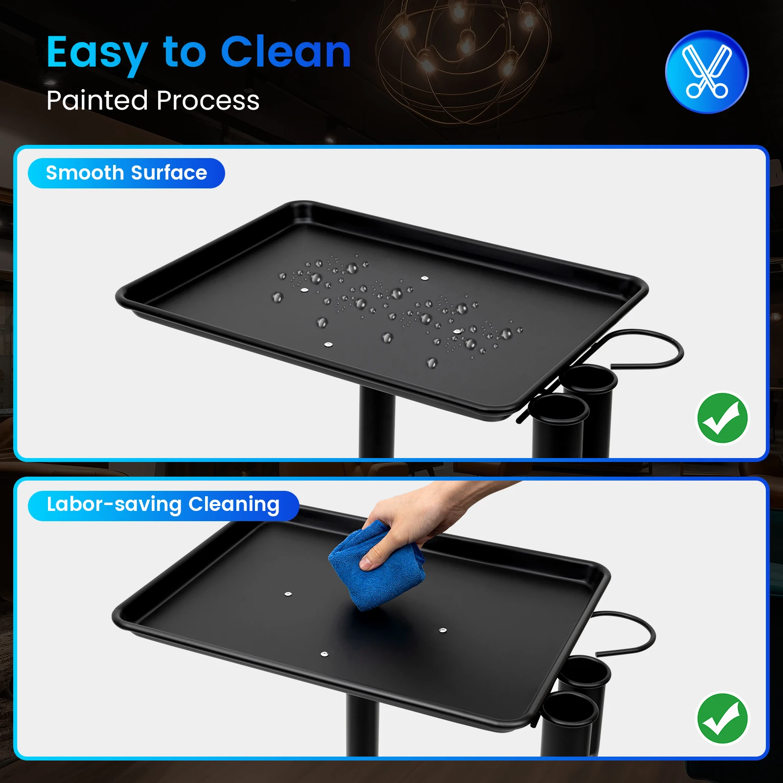 Large Capacity: The tray's size of 17.72*12.3 inches allows it to hold more than enough items. You can put hair coloring cream, scissors, combs, hair dryers, and other various tools on it. Such a large capacity is better for barbershop use.