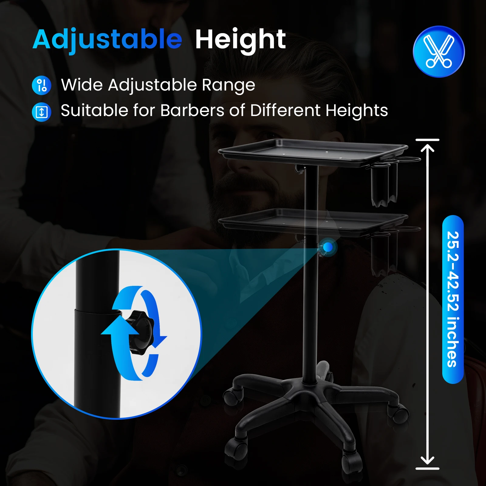 Adjustable Height: You can adjust the height of it between 25.2-42.52 inches by gently turning the knob, so it is suitable for barbers of different heights.