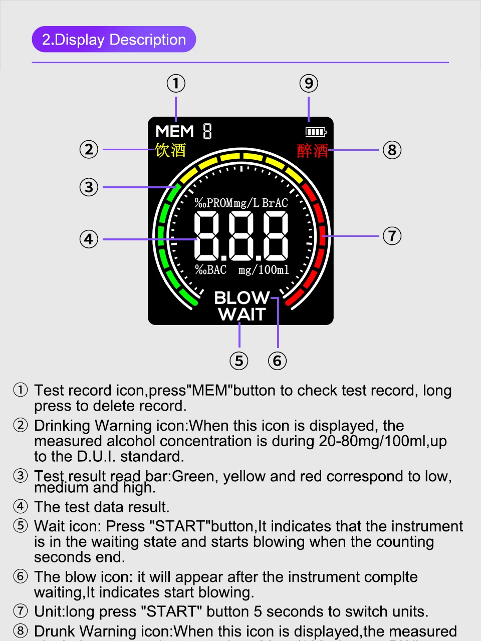 1: The first time the instrument is used, people who have not drunk alcohol may also have a reading for the blow test, which is normal, which is caused by the properties of the instrument sensor, and it is recommended that you let the instrument perform a test without blowing before using it.