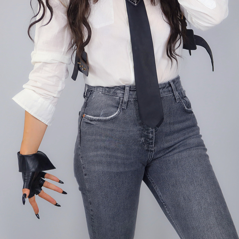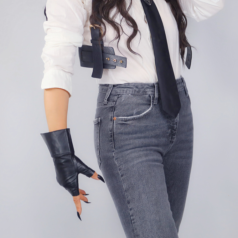 REAL LEATHER FINGERLESS GLOVES Black Wrist Foldover Lambskin Half Finger LLDLLNT