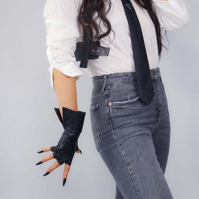 • REAL LEATHER FINGERLESS GLOVES Black Wrist Foldover Lambskin Half Finger LLDLLNT