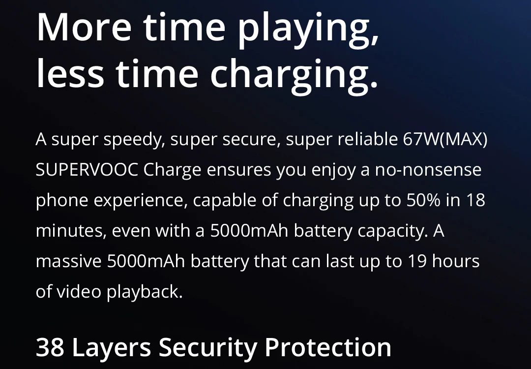 Battery--------- 67W SUPERVOOC Charge, 5000mAh Massive Battery