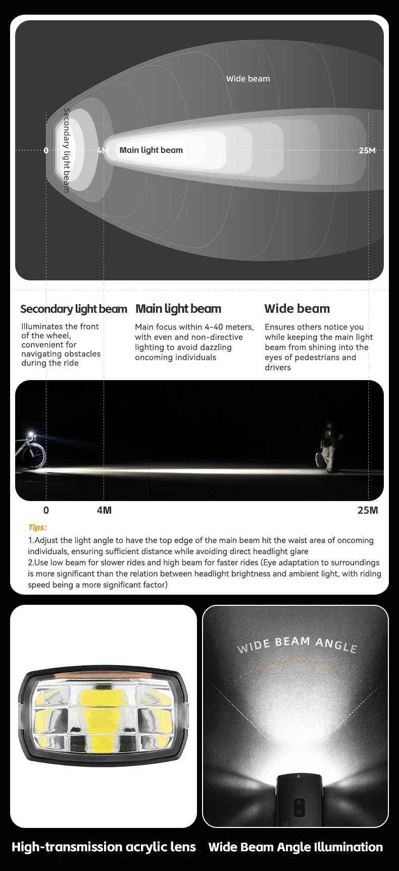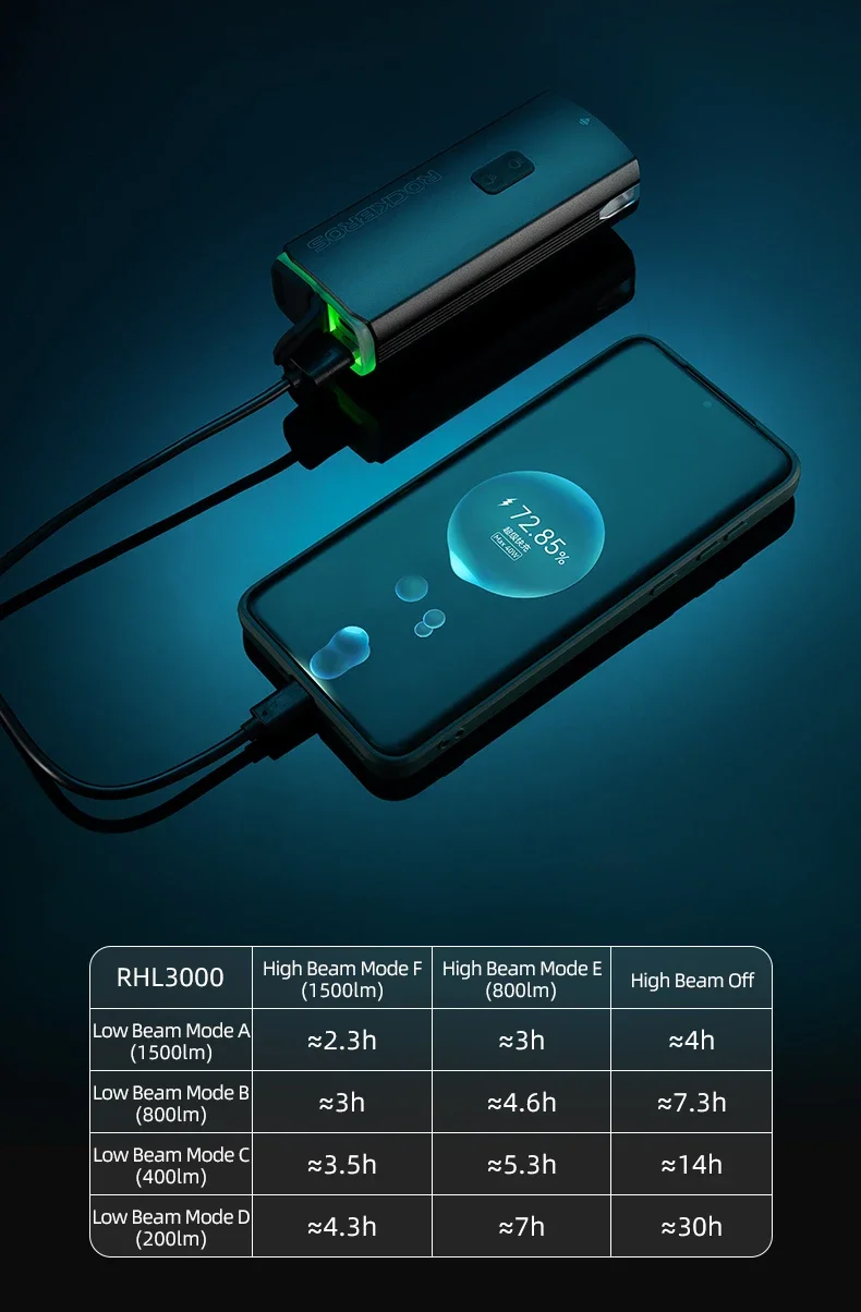 When both high and low beams are on, the combined illumination reaches 3000 lumens, providing ample light coverage for nighttime cycling