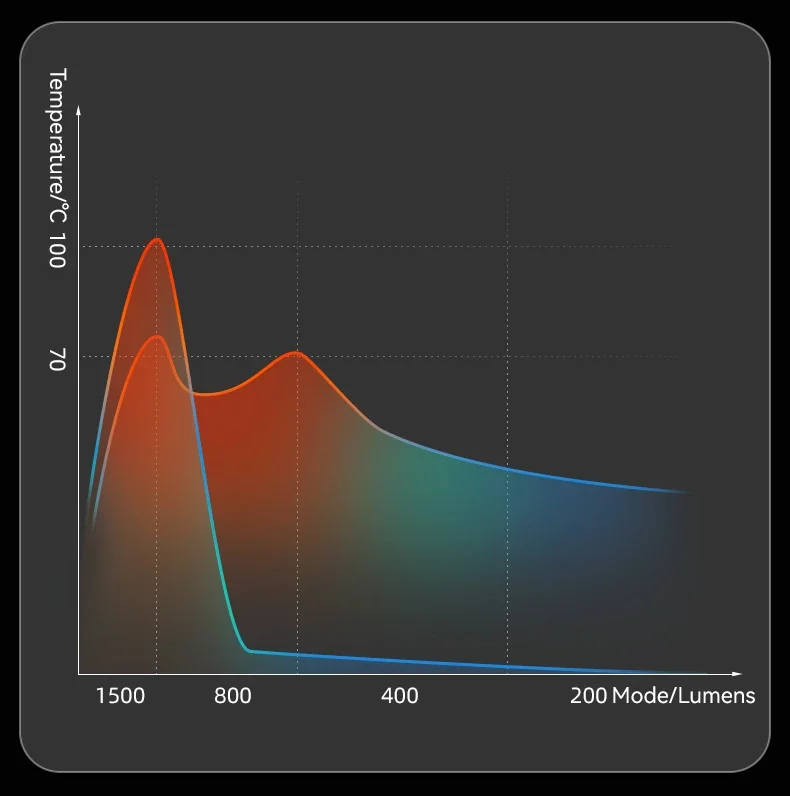When the power is lower than 15%, only 400lm and 200lm are allowed to be adjusted; the battery voltage drops to the warning line to cut off the power supply to protect the battery