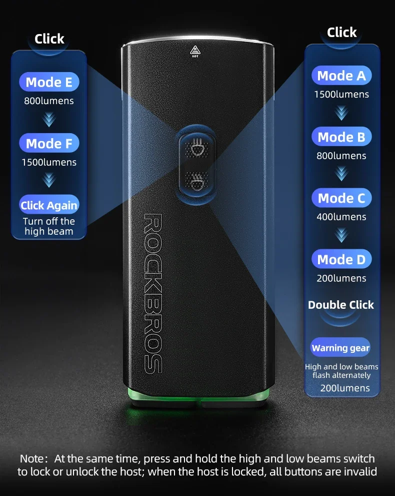 Press and hold the high beam button, turn on the low beam and high beam at the same time,and both the high and low beam modes are set at 1500 lumens