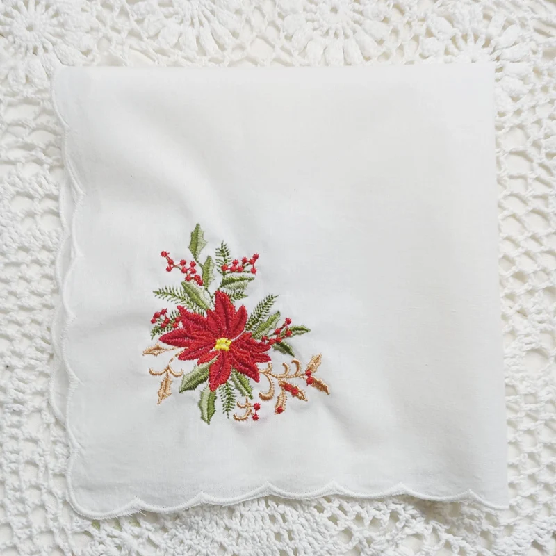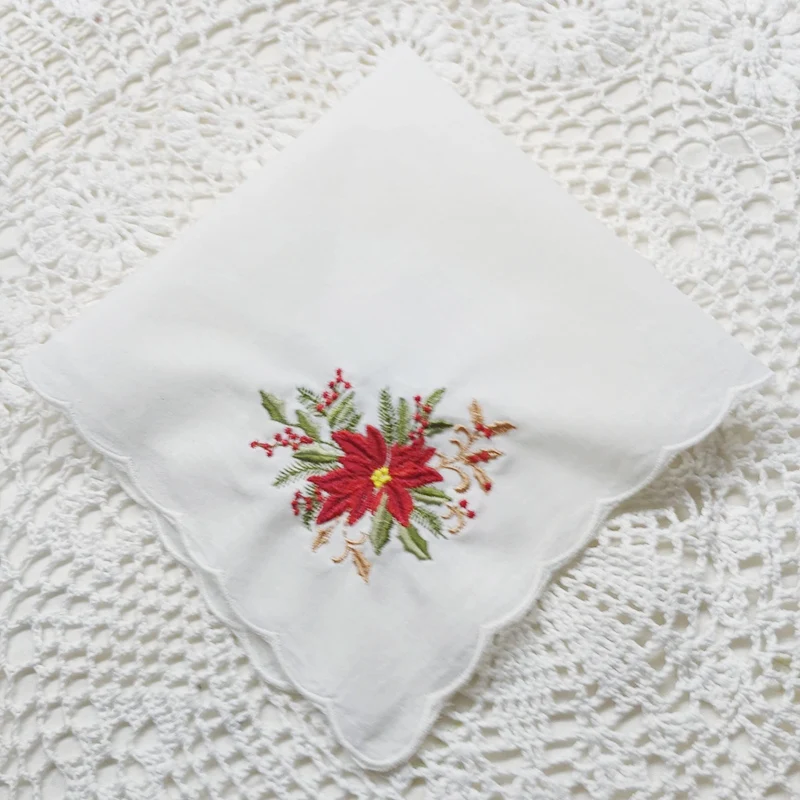 Set of 12 Handkerchiefs White Cotton Cloth Fabric Wedding Hankies Scalloped Edges Hanky Embroidered Floral 12"x12"