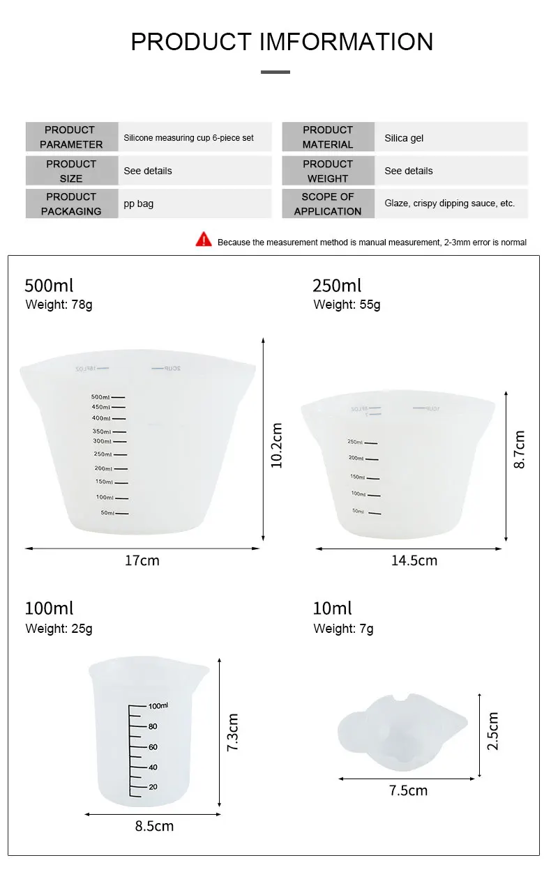 10/100/250/500ml Measuring Cup Food-Grade Silicone Standard Mixing Cup Measuring Jug Bowl Pot Kitchen Pastry Cake Baking Tool