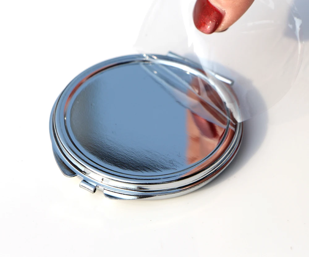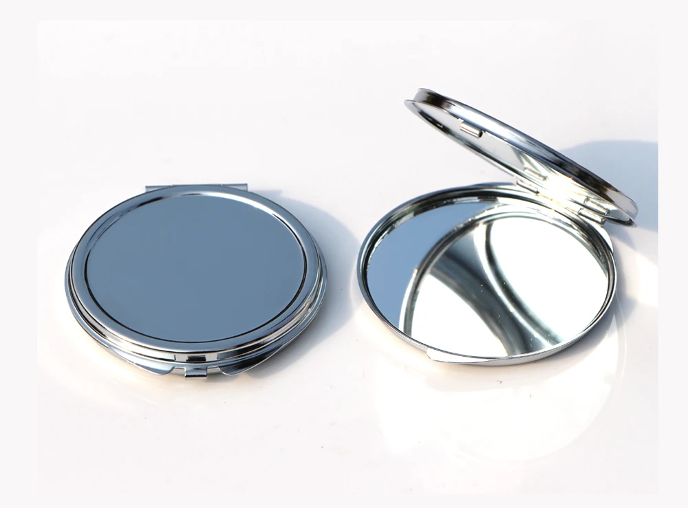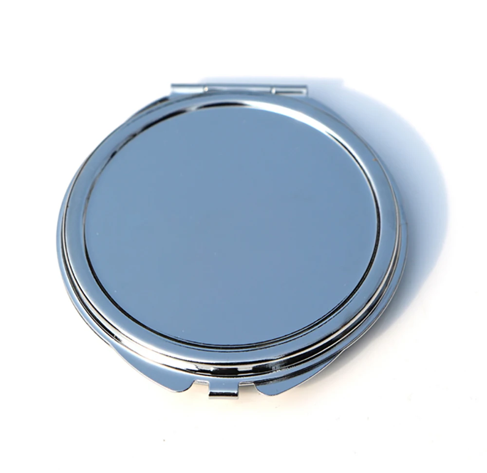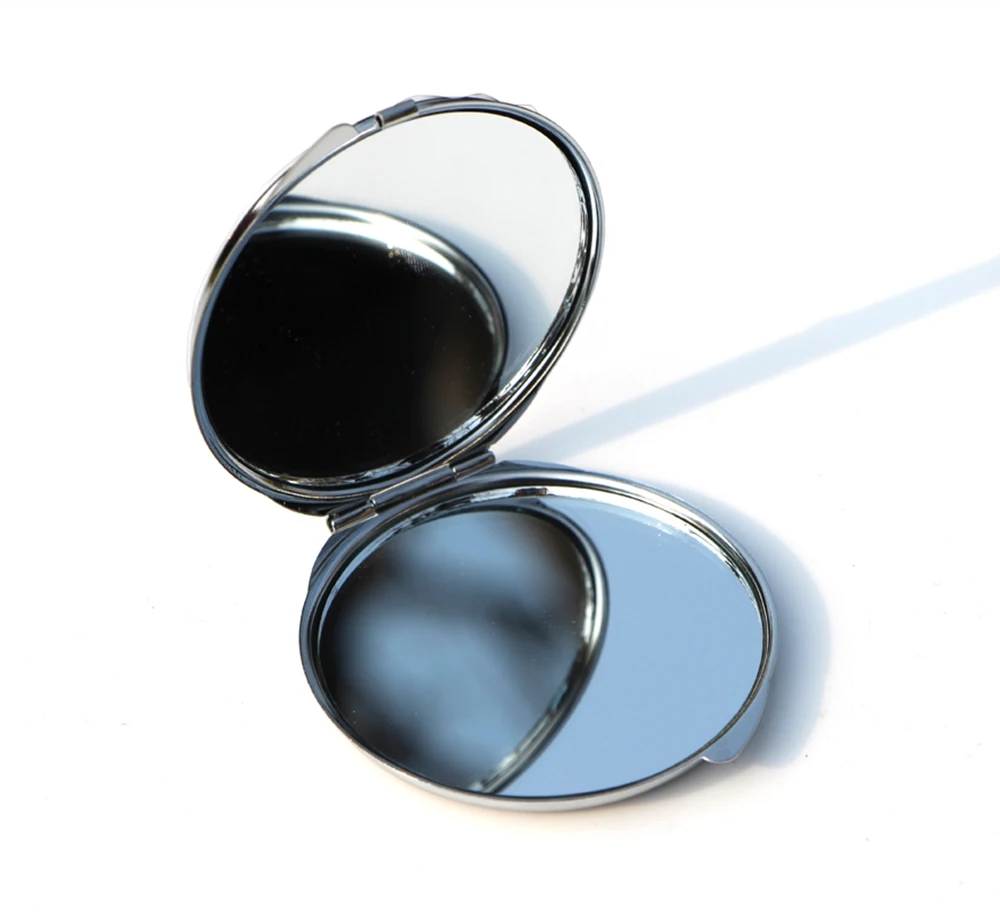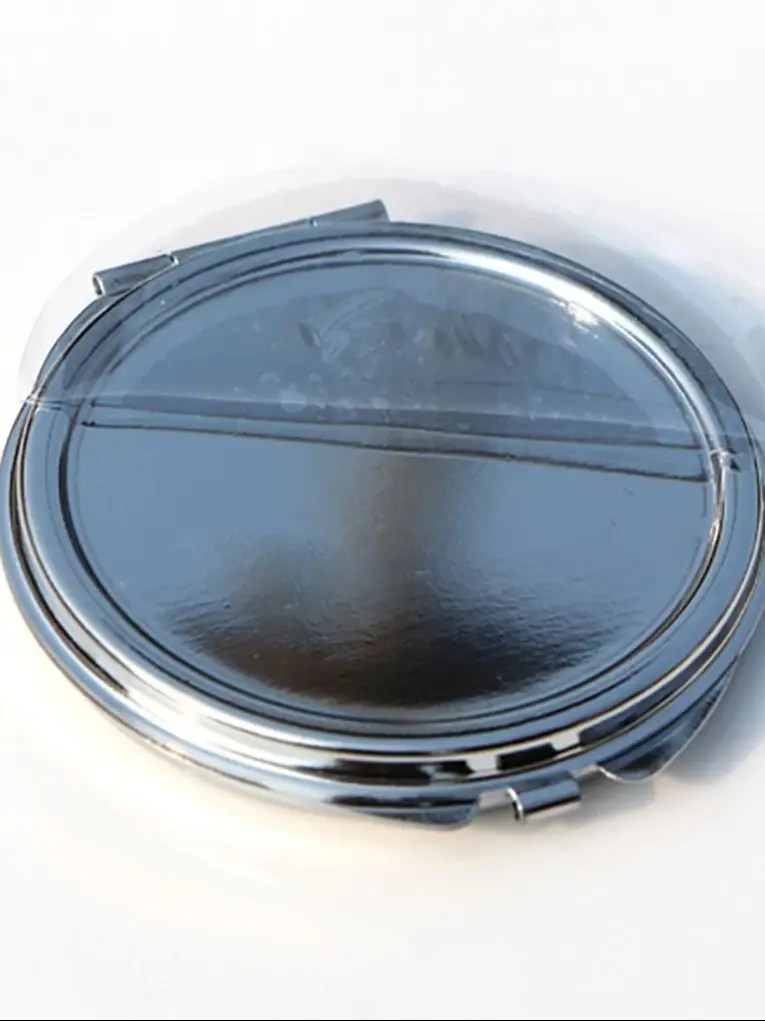 This compact mirror is a shiny silver tone case...measures 2.4 inches (62mm) in diameter. As you open the the compact there are mirrors,one is regular mirror and the other one is 2x magnifying mirror.