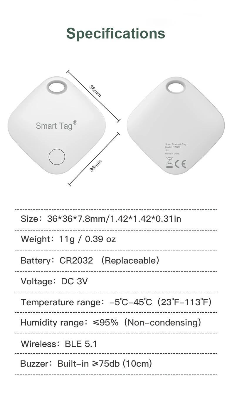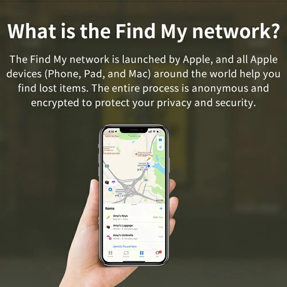 Apple ID: Install iPhone and iPad touch models with IOS14.5 or later,Install iPad models with iPad OS14.5 or later;Your Smart Tag sendsSmart Tag to iCloud — then you can go to the Find My app and see it on a map. The whole process is anonymous and encrypted to protect your privacy.