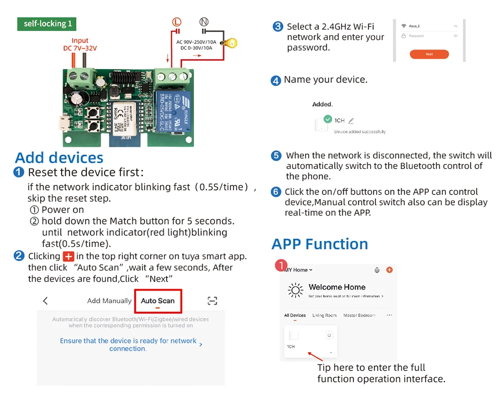 Default inching Function: Press the open relay by mobile phone, then cut off the pull-on imediately, you can set the inching time in APP , it has the timing-share function at the same time.