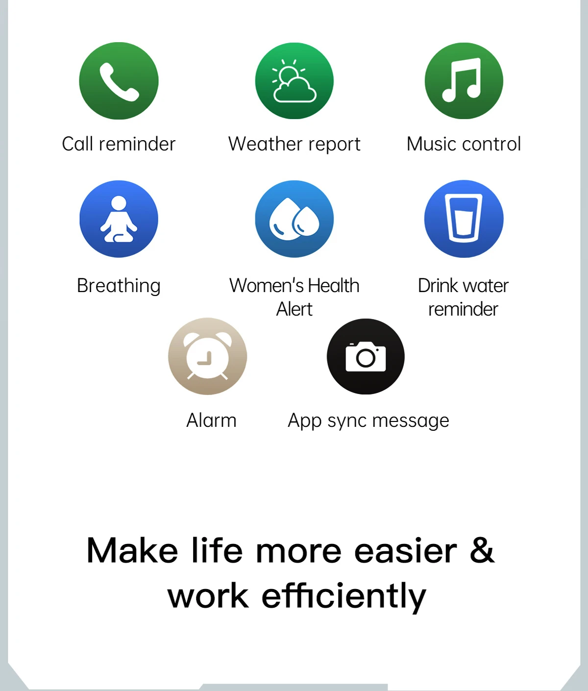- Fashion smart watch: Heart rate, blood pressure, sleep, alarm clock, etc.