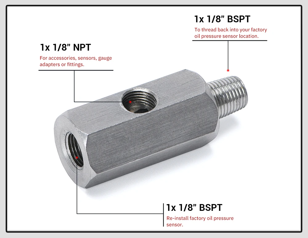 1/8" BSPT Male to thread back into factory oil pressure sensor location.