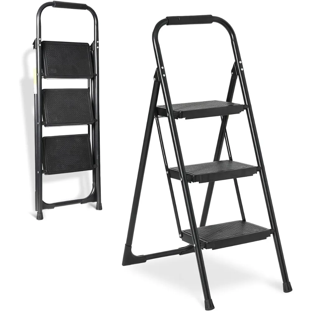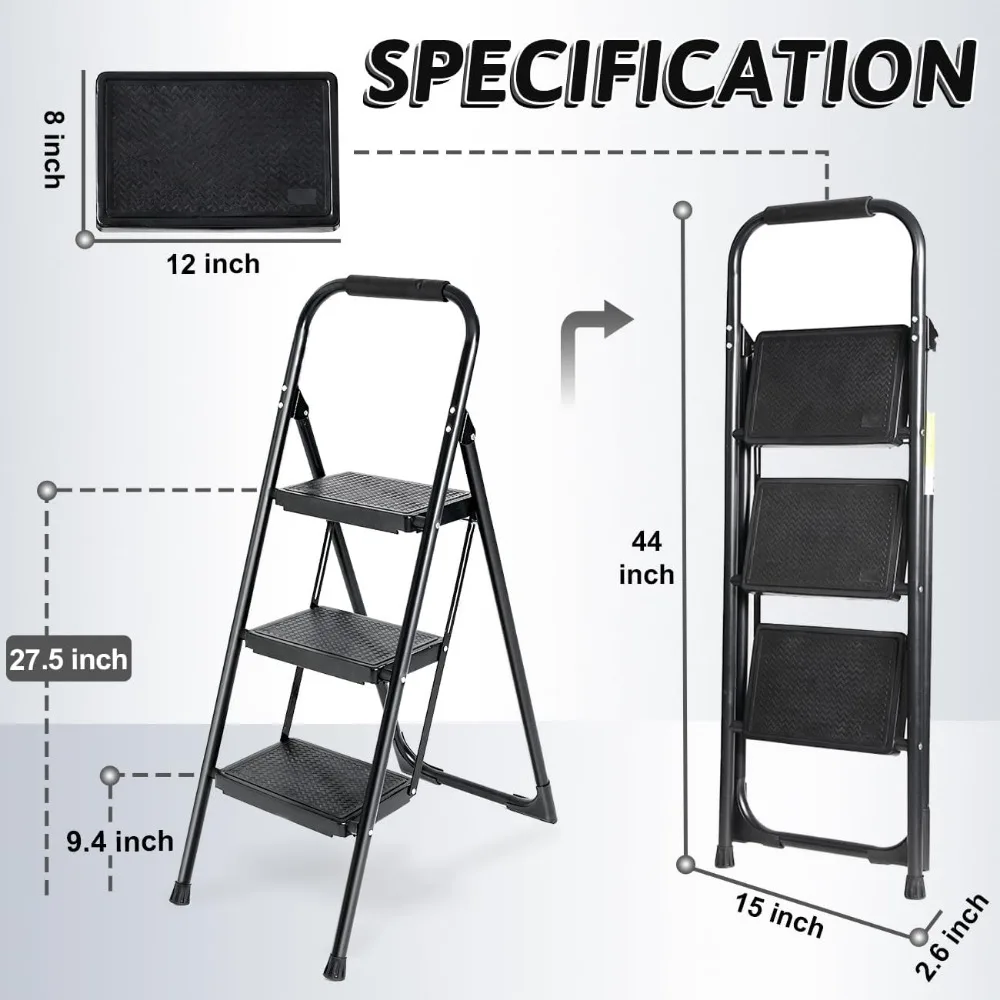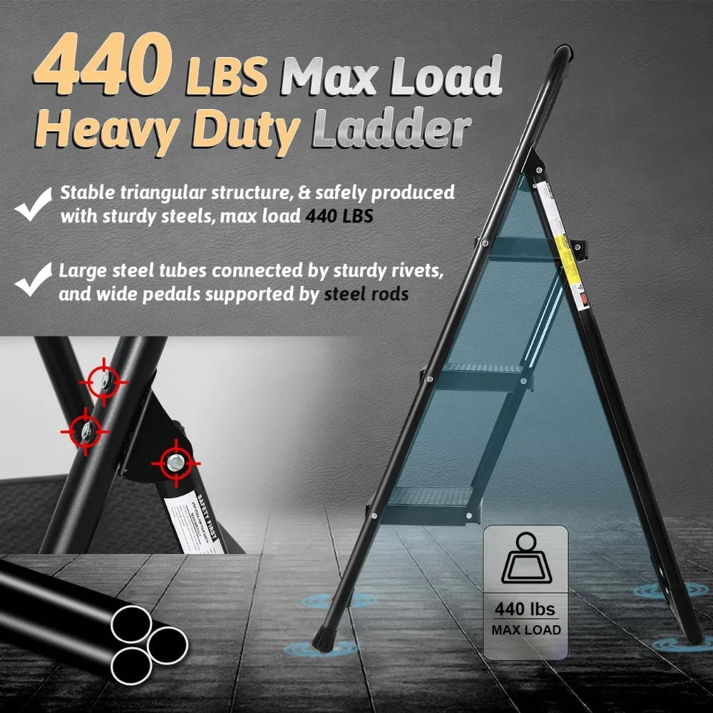 - 【Heavy Duty Max Load 440 Lbs】Double Elite has upgraded the heavy duty 3 step folding step stools for adults. They are sturdy enough to support max load 440 lbs (others usually only 330 lbs), thanks to premium materials & upgraded support structures. The upgraded step ladder uses a steel tube replacing 2 of the ladder legs, more contact surface & stable structure added. The step ladders for home 3 step/kitchen/closet, will safely & stably raise you up 27.5 inch off the ground.