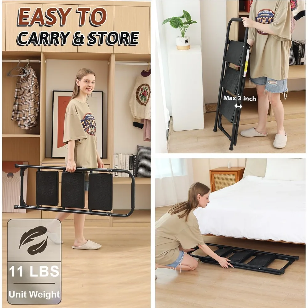 - 【Easy to Use】The small portable three step ladder with handgrip is not only easy to use for women / men, but friendly to children & the elderly. All can set it up in seconds barehanded, as it arrives assembled. It's easy to carry the some 11 Lbs metal step ladder indoors or for outdoors use, since the small ladder is made of lightweight Steel Alloy & plastic, and with convenient handgrip for moving.