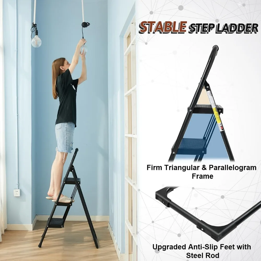 - 【Sturdy & Safe 3 Step Ladder】Double Elite step ladder 3 step folding is well designed & made for sturdy & safe use. Our R&D team has designed the 3 step ladder with stable triangular frames, widened pedals & thickened beams for reliable support. Made of premium quality Steel Alloy & plastic, this sturdy 3 step stool outperforms most regular steel ladders in the market. The step ladder with sponge wrapped handgrip is convenient to hold, and will reliably support you while climbing.