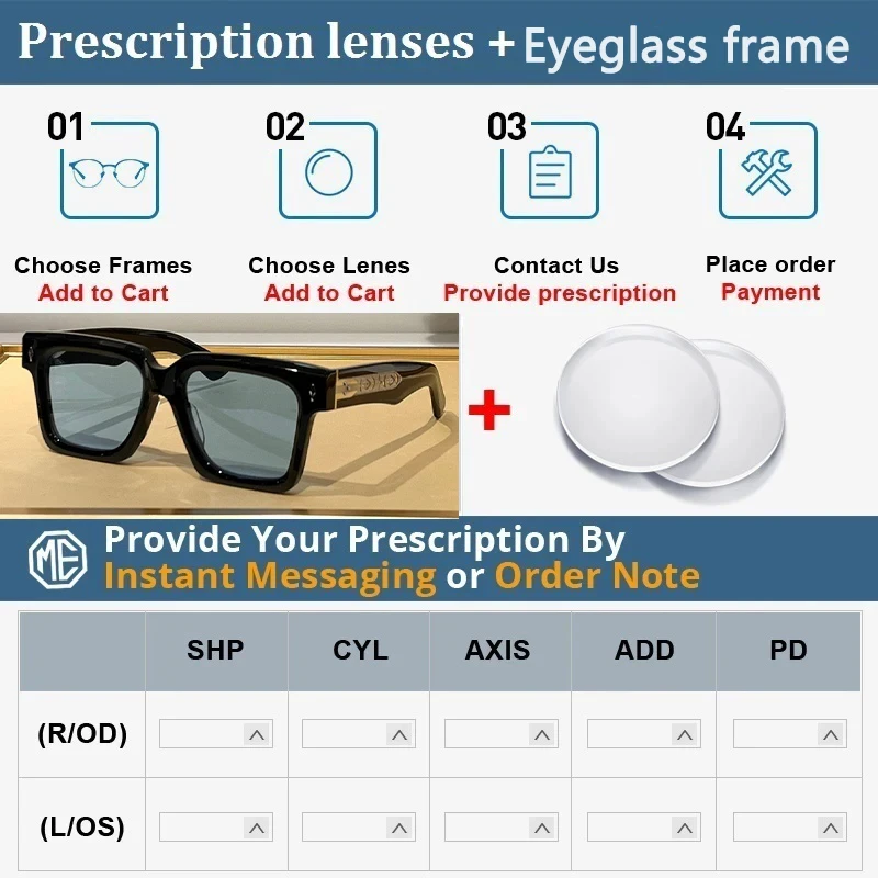 So we can customize any lens that buyers want, such as polarizing prescription lens,Photochromic prescription lenses,presbyopia lens, multifocal progressive lens, color lens, color prescription lens, etc. if you need to customize the lenses,you can place an order in the following link, And leave a message to our customer service staff about your prescription,or the type of lens you want. After we make the lens according to the buyer's requirements, we will install it in the glasses and mail it